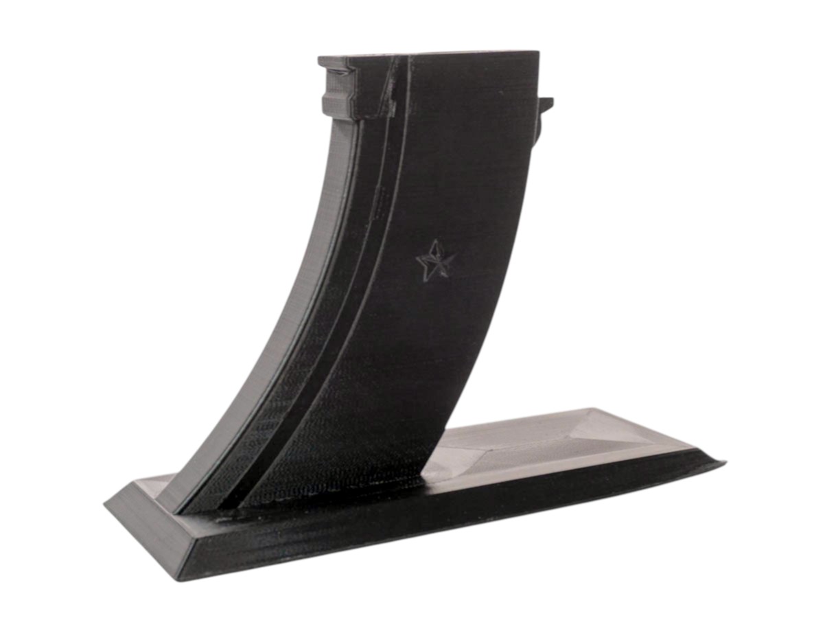 Подставка Strike для приводов АК серии выполнена из PETG пластика по технологии 3D печати. Материал отличается гибкостью и высокой устойчивостью к нагрузкам. Кроме того, он имеет высокую прочность. Все это обеспечит изделию длительный срок службы. Подставка монолитна, изготовлена в виде магазина для Автомата Калашникова. Для установки привода необходимо вытащить магазин и установить вместо него держатель. Данная компоновка сделает хранение более эффектным.