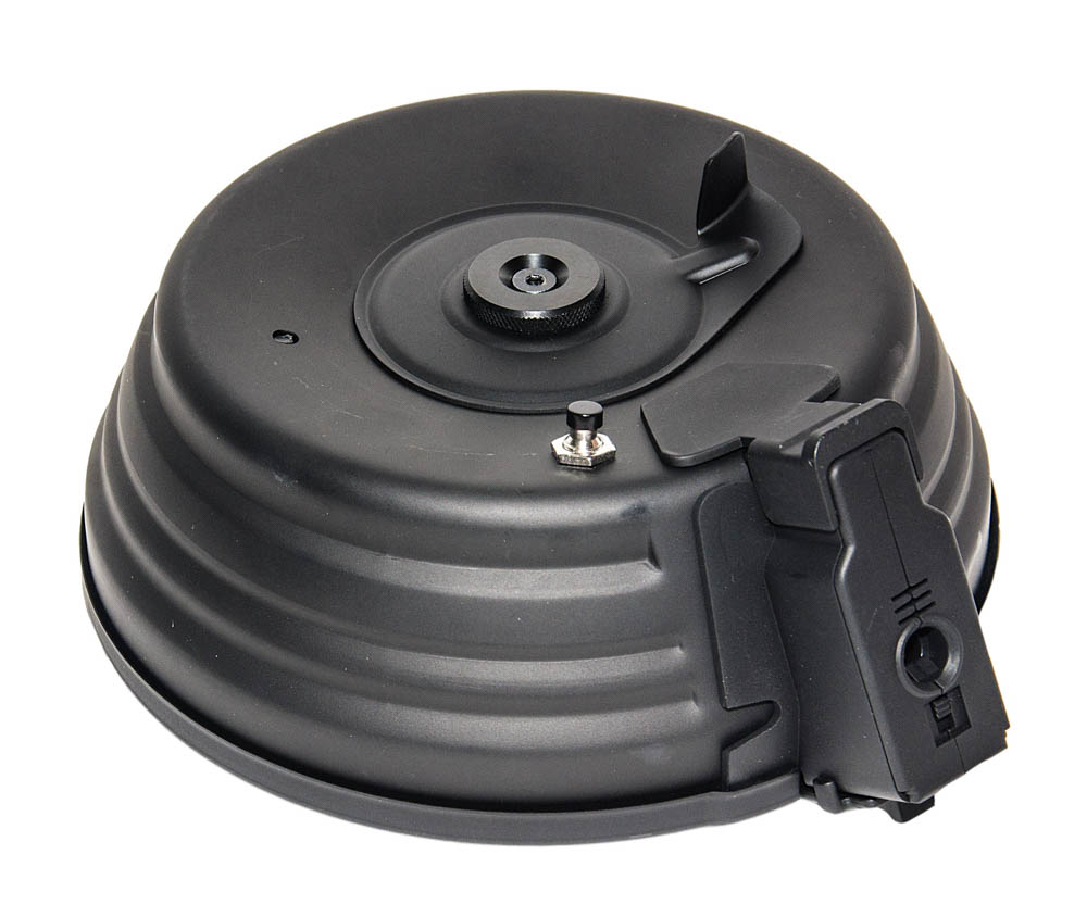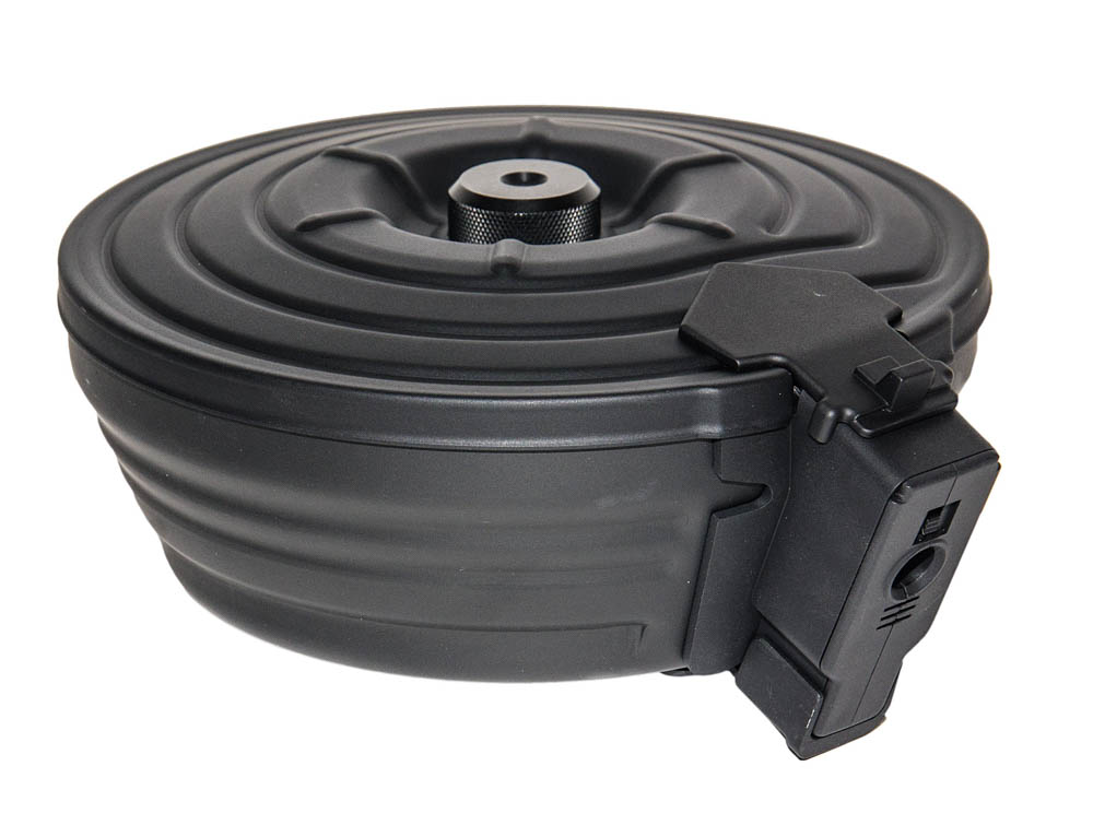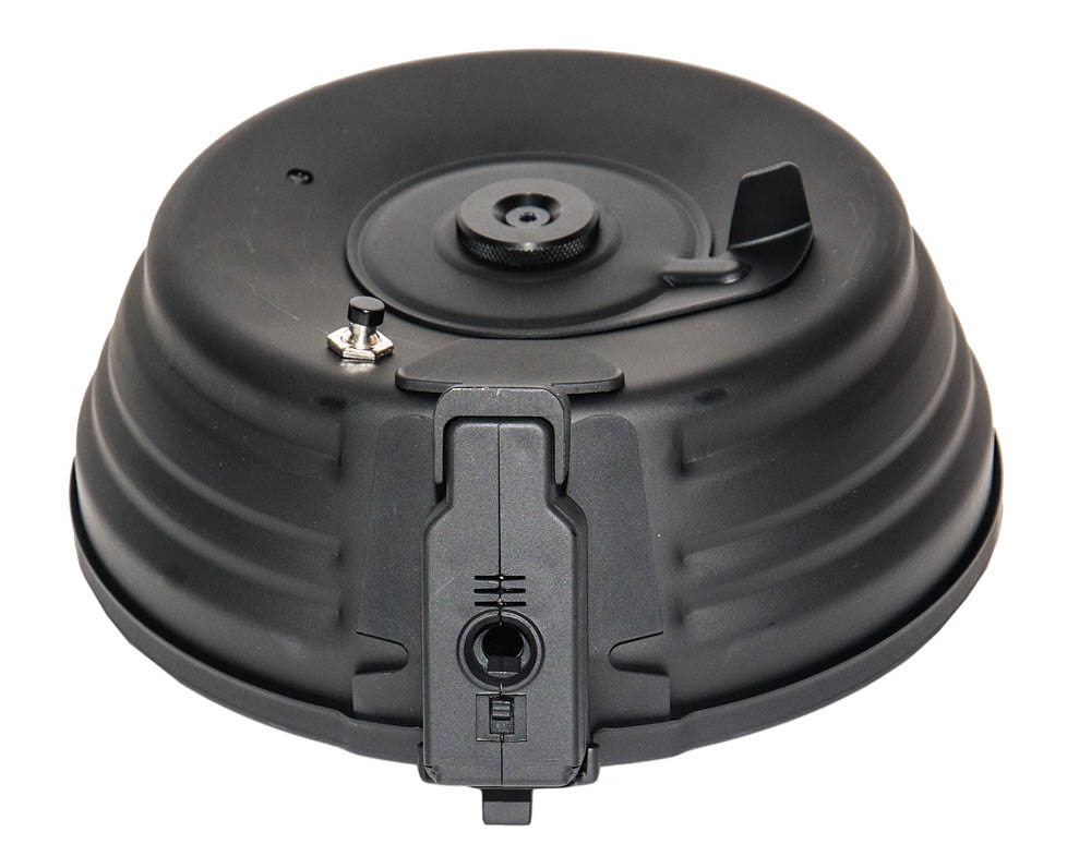 Бункер выполнен в виде барабанного магазина повышенной емкости на 75 патронов 7,62x39 мм (он же «бубен» или «улитка») для пулемета РПК.