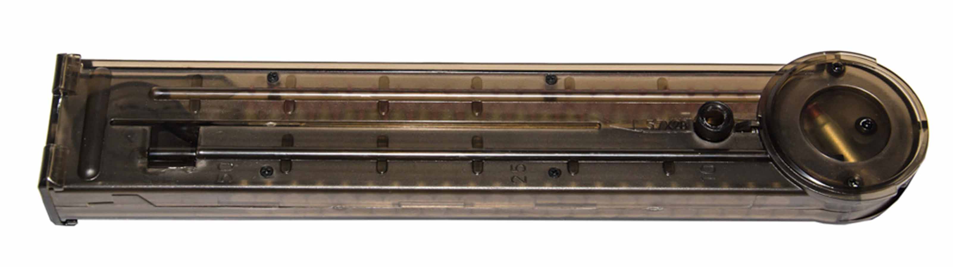 Внешний корпус магазина c121 сделан из ударопрочного пластика, внутри вставлены макеты патронов 5.7х28 мм. Длина магазина превышает большинство аналогов среди пистолетов-пулеметов типа MP5, так что подсумки нужно искать именно под P90. Вместительность магазина составляет 70 шаров. Благодаря механическому типу подачи, шары подаются бесперебойно, за счёт силы распрямляющейся пружины. Благодаря этому, по сравнению с бункерами, механы более антуражны (нужно менять магазины, как в настоящем оружии) и лишены звука гремящих шаров во время передвижения владельца.