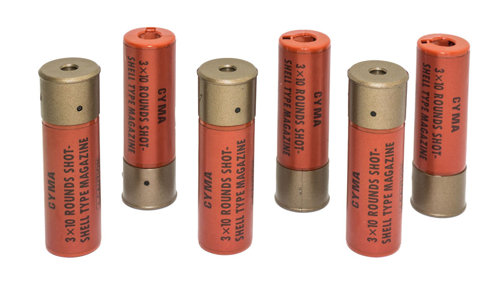 Набор шеллов (патроны для ружей) от фирмы Cyma, которые совместимы со спринговыми дробовиками данного производителя, а так же их аналогами. Каждый патрон вмещает в себя 30 шаров. Патроны можно снаряжать руками, но лучше использовать лоадер. Комплект поставки включает 6 шеллов. Материал изготовления ударопрочный пластик.