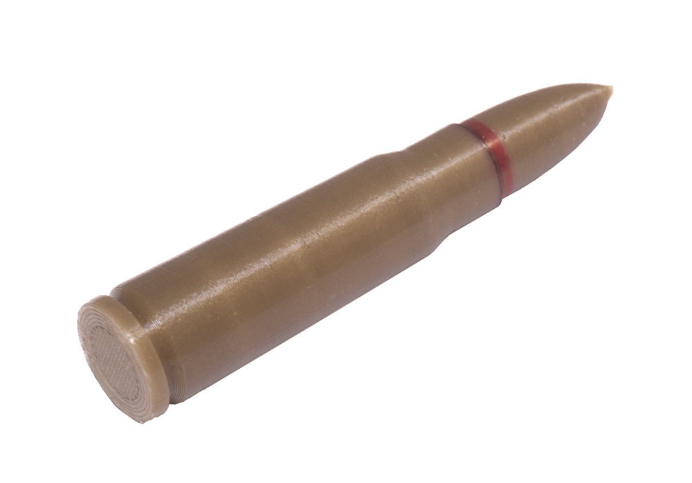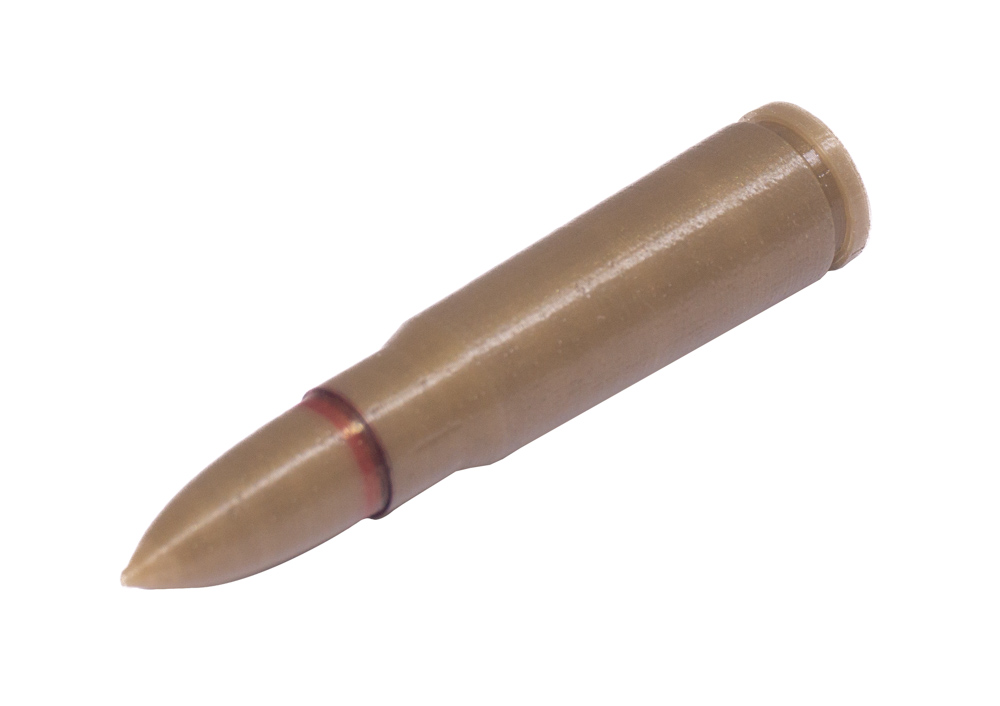 Макет патрона от Автомата Калашникова калибром 7.62х39. Спроектирован и напечатан на 3D принтере компании Strike. Представляет собой полноразмерную копию патрона 7.62 ПС образца 1943 года. Изделие изготовлено на 3D принтере из специального печатного PETG пластика, что отличает его высокой прочностью. Копия патрона может быть использована для самых разнообразных целей, например в качестве сувенира. Также можете покрасить патрон в нужный вам цвет или приделать к нему петельку и использовать в качестве брелка.