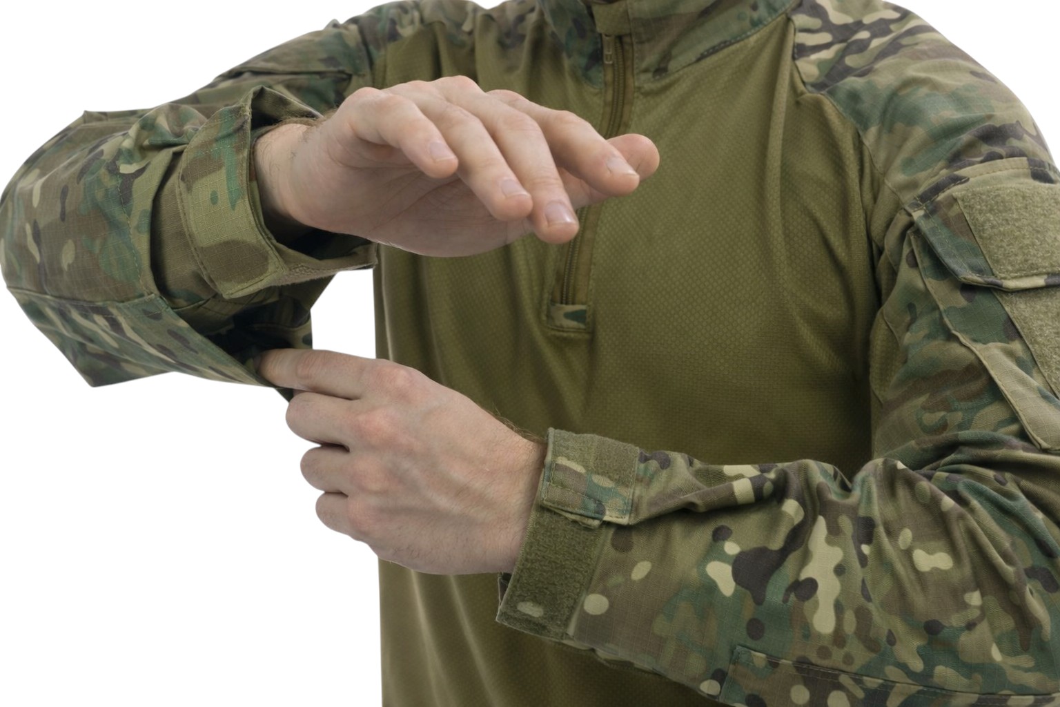 На рубашке имеются панели велкро на карманах рукавов для размещения патчей и нашивок. Манжеты регулируются так же легко, за счёт липучки, поэтому простым движением их можно ослабить или подтянуть, а широкий срез позволяет спокойно закатать рукава, когда становится жарко или нужно больше свободы. Воротник на молнии даёт возможность быстро застегнуться от ветра или наоборот открыть грудь для вентиляции в жаркую погоду.