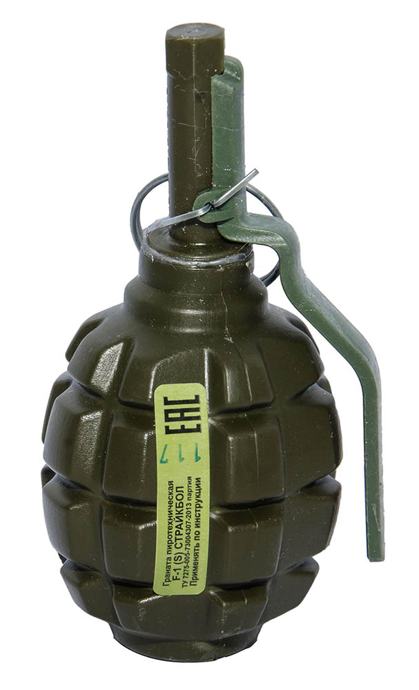 Граната производителя PyroFX F-1 (S) является страйкбольной копией советской оборонительной гранаты Ф-1. Корпус тренировочного образца выполнен из полимерного материала, что позволит использовать изделие даже в плохую погоду, не беспокоясь о том, что оно сработает. Стоит отметить наличие активной скобы, благодаря которой можно избежать нежелательного разрыва пиротехнического элемента, когда чека уже выдернута. Время срабатывания изделия составляет около 3-4 секунд. В качестве наполнителя используется горох. Стоит отметить, что PyroFX F-1 (S) представляет собой антуражную копию боевой Ф-1. Это делает страйкбольный аналог хорошим выбором для использования во время реконструкций, а также понравится игрокам, моделирующим армию РФ.