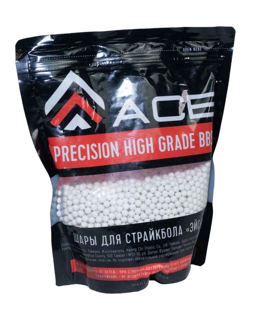 Отличный вариант, сочетающий в себе неплохое качество исполнение вкупе с бюджетной ценой. Произведены шары под брендом ACE в Тайване. Упаковка шаров плотная, весит порядка одного килограмма, вместимость около 4000 шаров. Диаметр страйкбольного шара имеет 5.95 мм, с минимальной погрешностью в 0,01 мм. Шары весят 0,25 грамм, что являются золотой серединой между мощностью, дальностью и точностью. Подходят отлично на страйкбольные привод с мощностью выстрела около 110-130 м/с.
