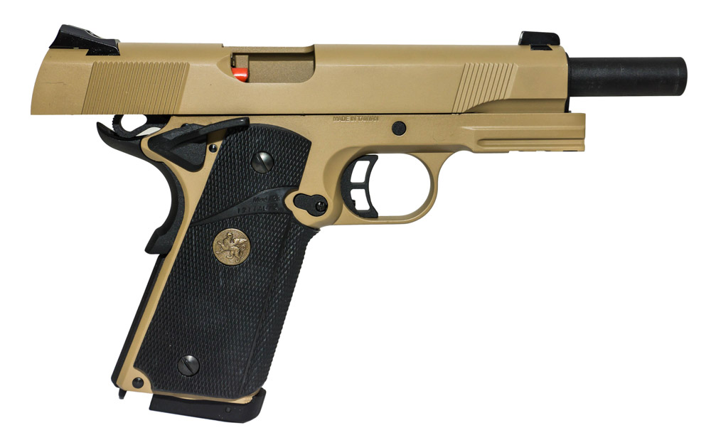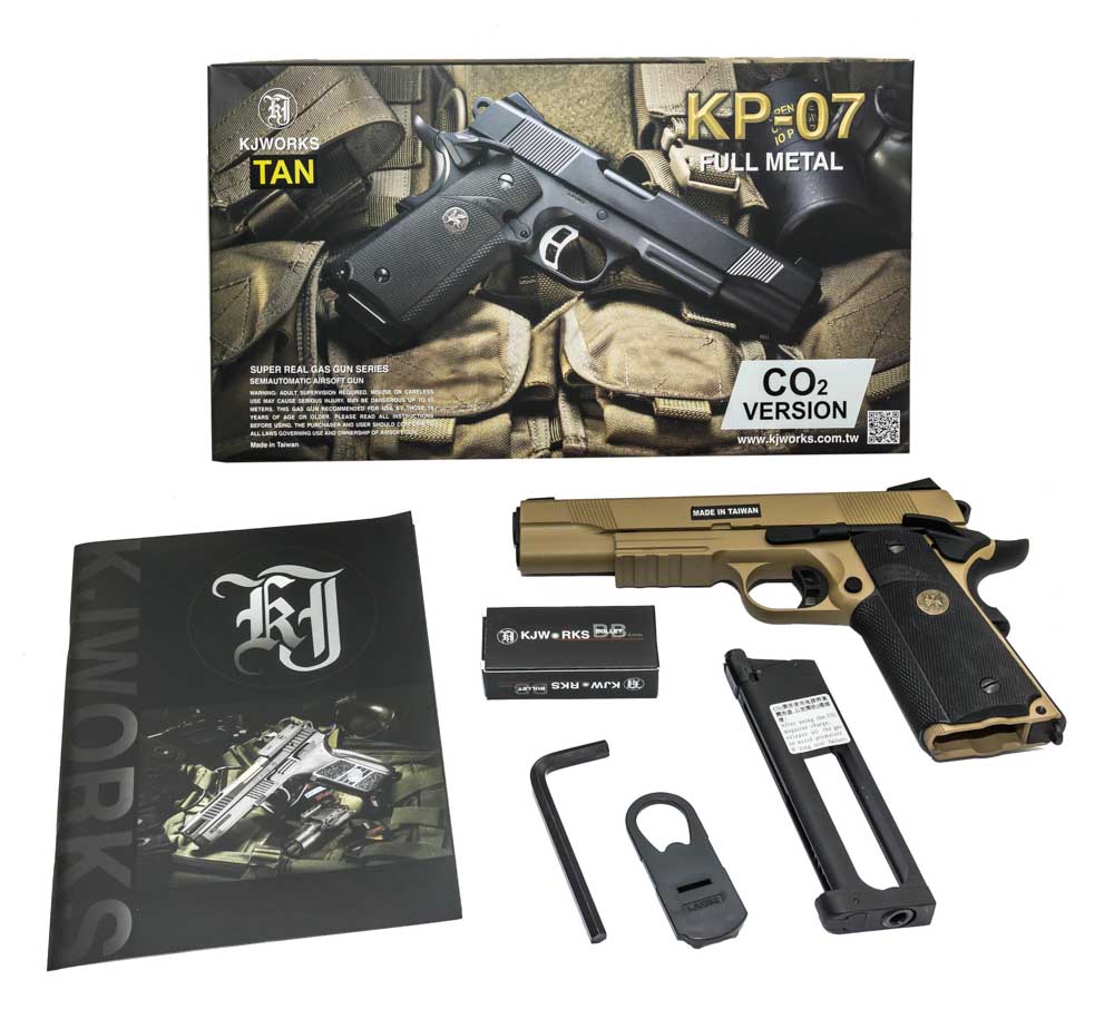Пистолет из линейки Colt 1911 изготовленный фирмой KJW воспроизводит известный в узких кругах кольт морской пехоты США, имеющий рабочее обозначение MEU - Marine Expeditionary Unit. Страйкбольная версия выполнена в песочном цвете очень точно копирует внешний вид и массу боевого аналога, в том числе внешнюю работу механизмов предохранителя, хода затвора и досылания боеприпасов в ствол. Пистолет полностью выполнен из цинкового сплава, что придает затвору больше инерции при стрельбе и усиливает отдачу, добавляя приятных эмоций при стрельбе. Стволик пистолета имеет hop-up, поэтому стрелок может выбирать различный вес шаров для достижения оптимальных характеристик дальности и скорости. Начальная скорость полета шара массой 0.2г составляет 100м\с. Данная модель использует газ СО2, однако сам пистолет совместим и с магазинами на грингазе. Шахта магазиноприемника имеет зацеп для тренчика.