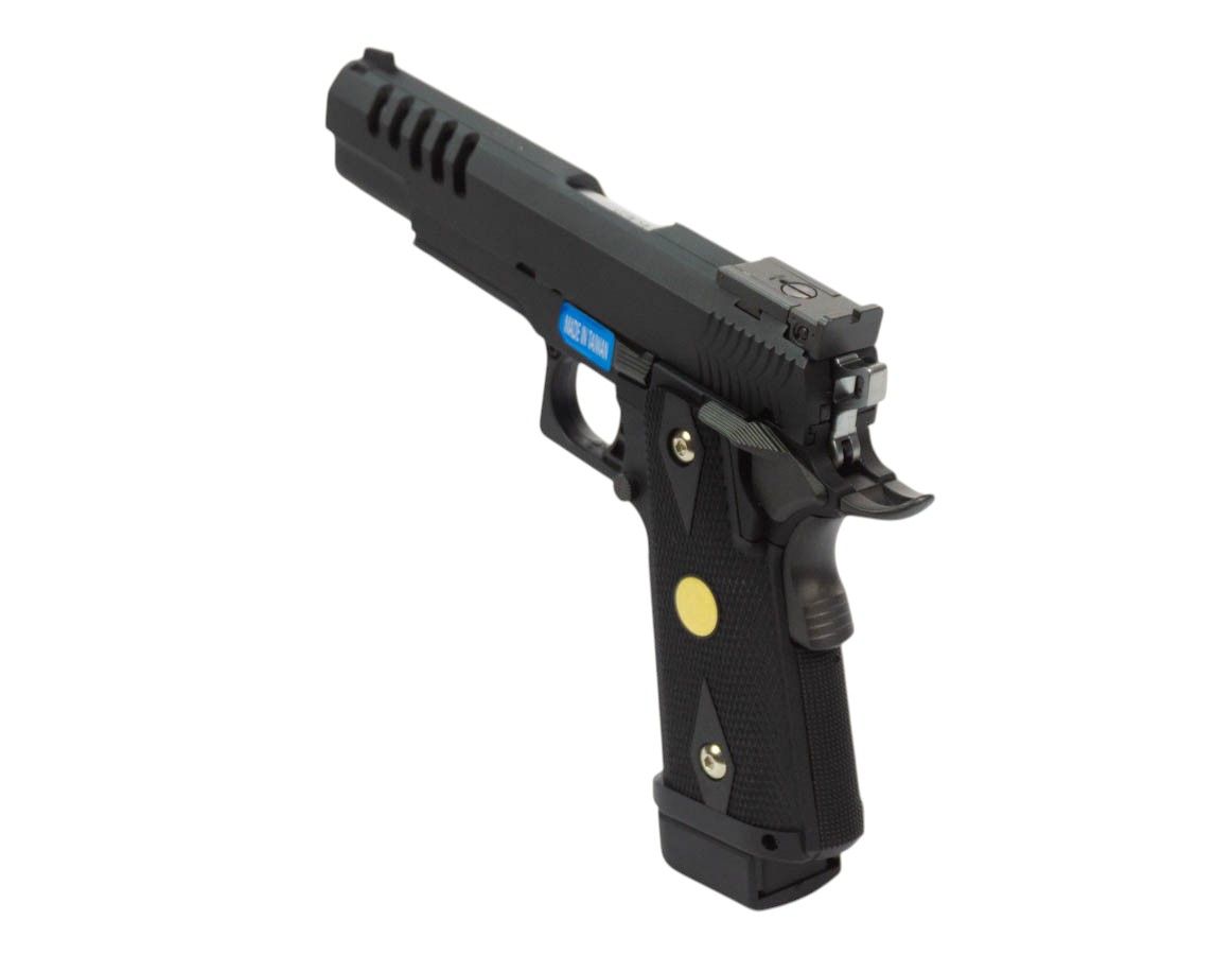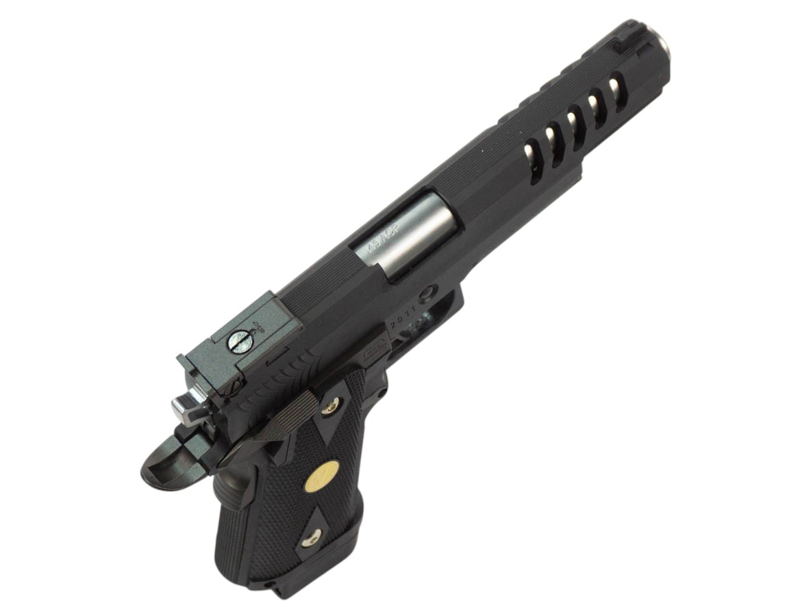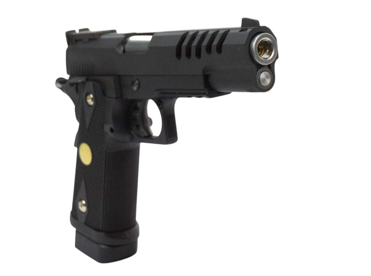 Пистолет от бренда WE Colt Hi-Capa 5.1 (WE-H002) — стильный и функциональный пистолет для тех, кто ценит эстетику и практичность. Модель повторяет привычную форму Hi-Capa с удлинённым стволом и перфорированным кожухом затвора — выборка в передней части облегчает вес и придаёт агрессивный вид. Корпус сочетает металлический сплав и ударопрочный пластик; хромированные элементы и противоскользящая насечка на рукояти добавляют эстетики и удобства хвата.