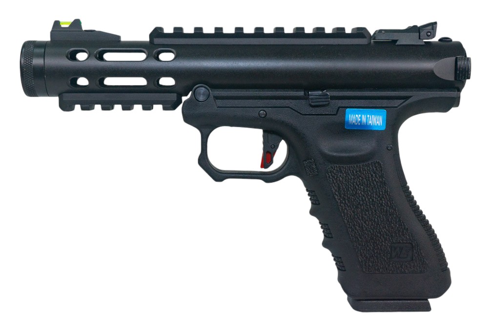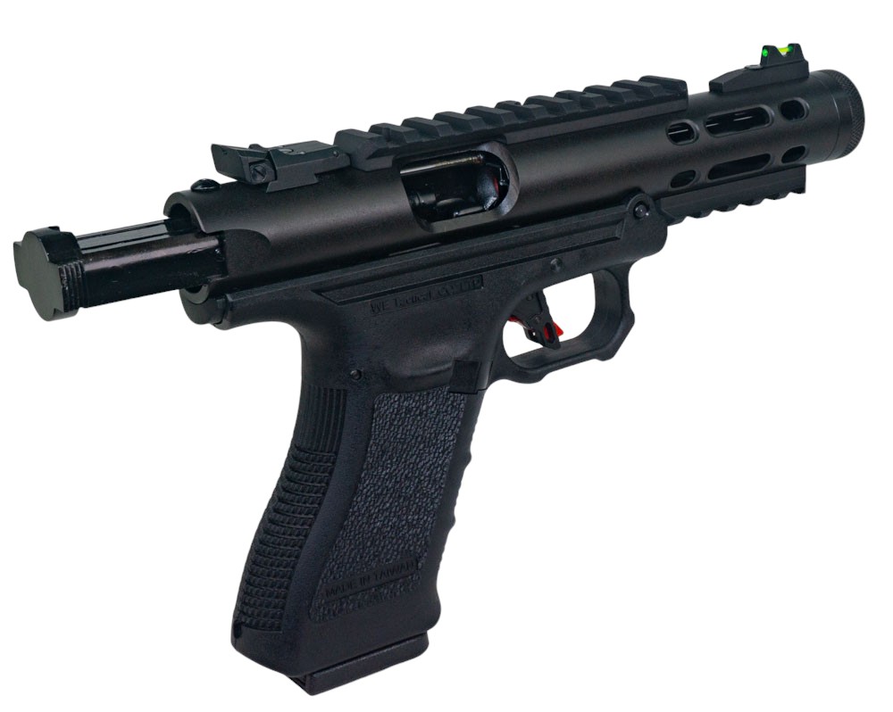 Основными особенностями пистолета являются его крепкая, высококачественная конструкция. Модель с артикулом we-gx01-bk изготовлена из прочных полимерных деталей, вдобавок с полностью металлическим стволом, благодаря этому пистолет имеет небольшой вес, что в свою очередь позволит владельцу эффективно и без особых сложностей обращаться с ним. Две съемные направляющие пикатинни в нижней и верхней частях ствола гарантируют, что вы сможете установить любые приспособления и сделать оружие по-настоящему уникальным. А также, имеется резьба под трассерную насадку для подсветки трассерных шаров.