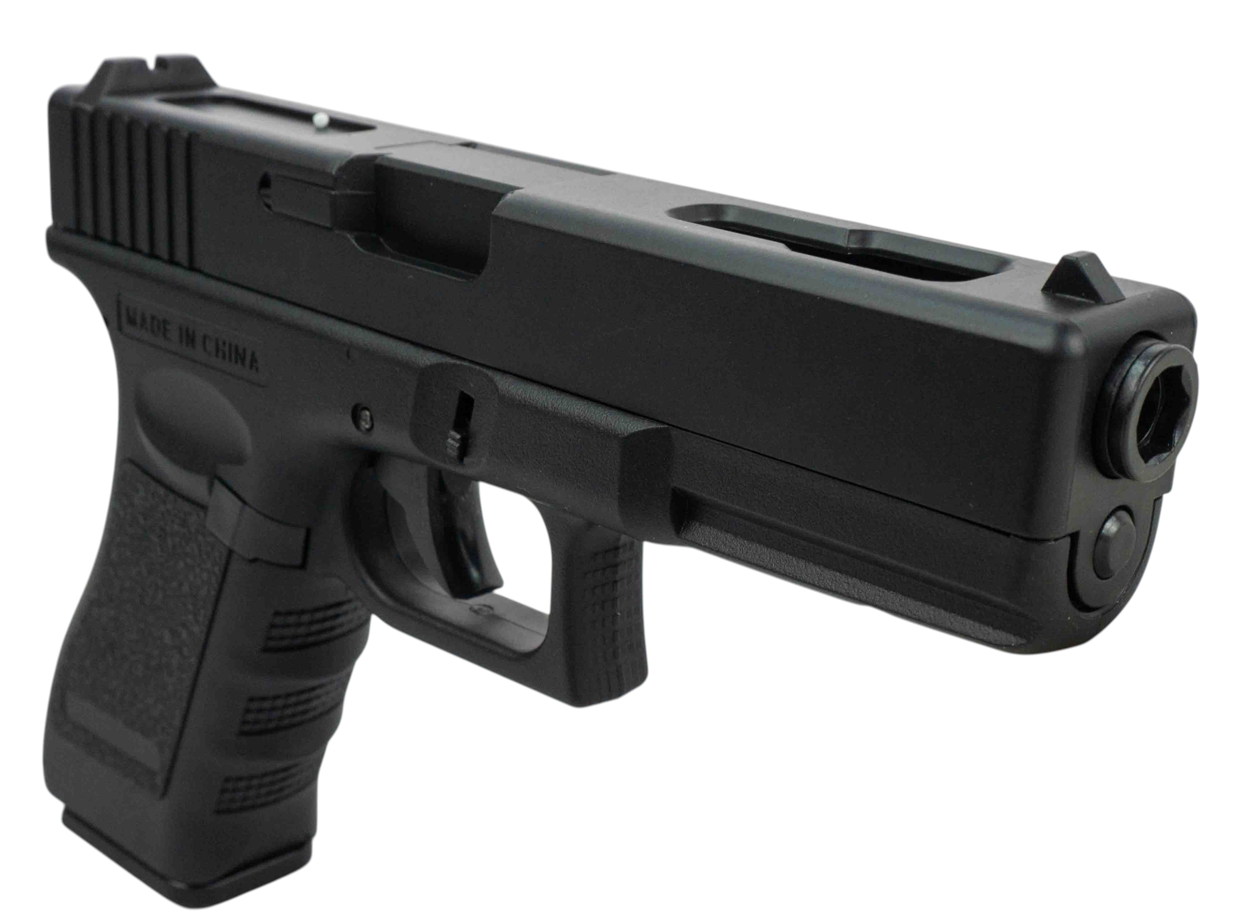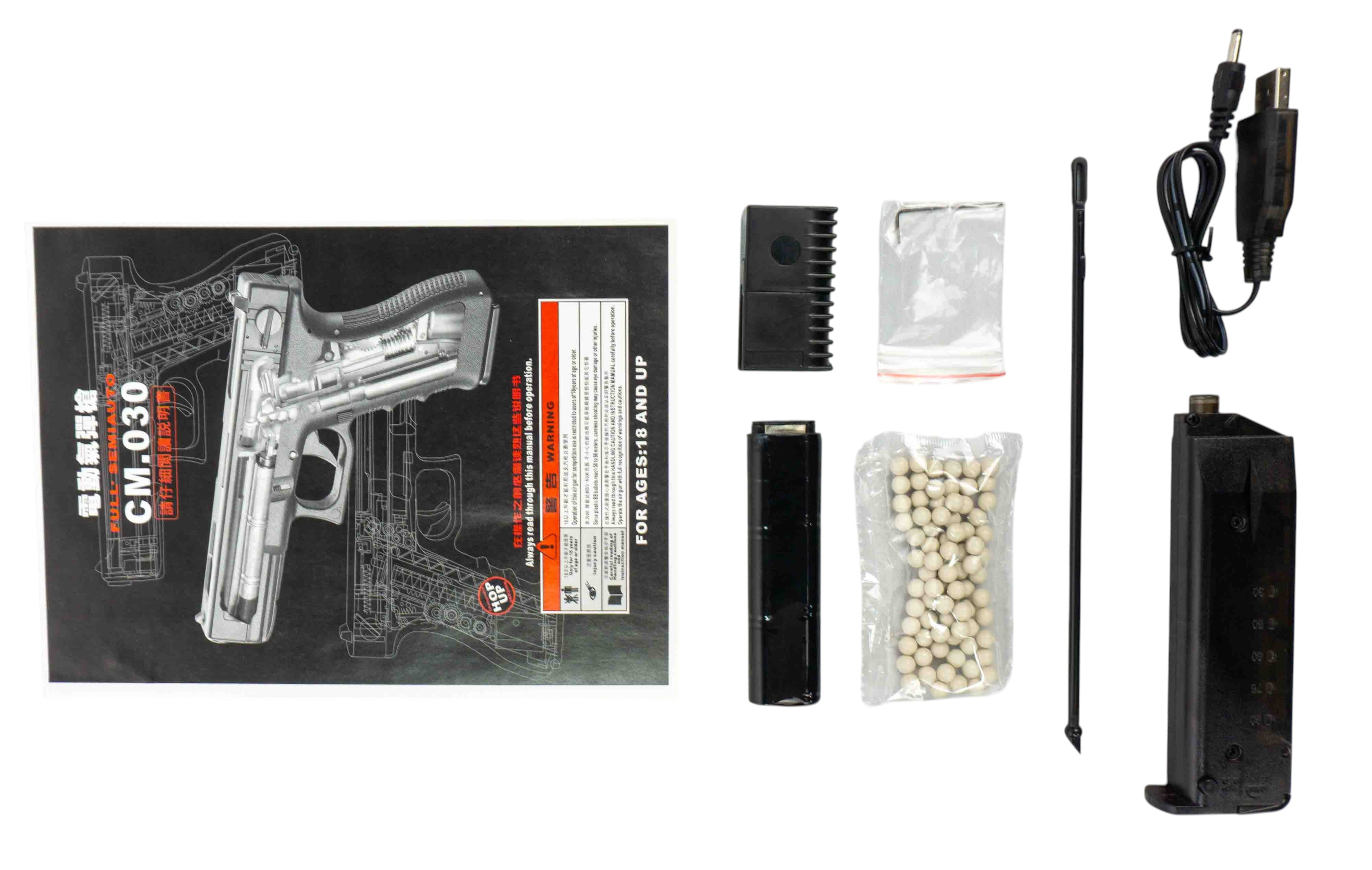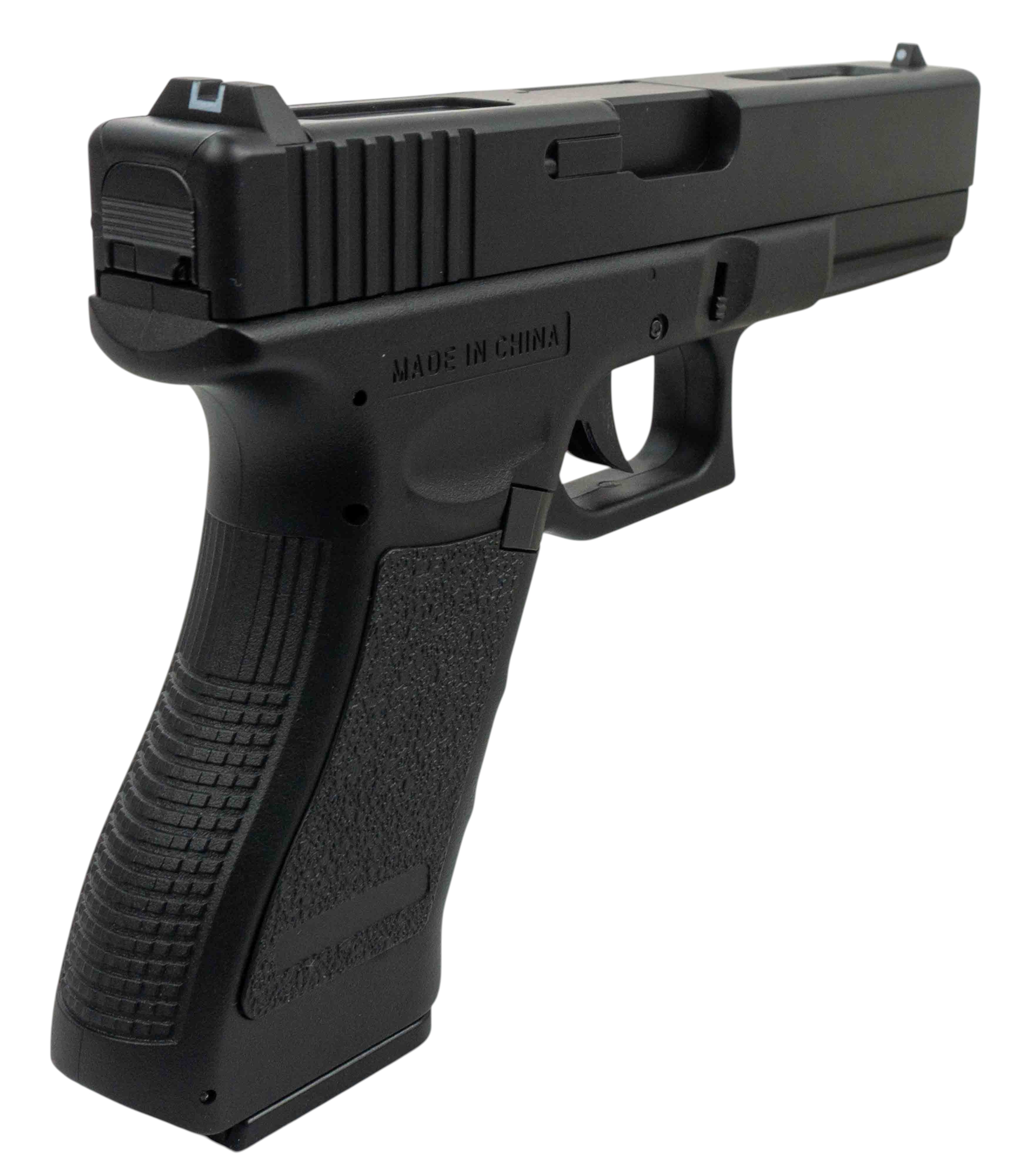 Модель пистолета Glock (Глок) от китайской фирмы Cyma (артикул cm030) выполнена из ударопрочного ABS пластика. В руке пистолет лежит хорошо благодаря удобной рукоятке. Вес равен оригинальному Glock 18 без патронов. Габариты довольно компактные, выступающих частей практически нет, поэтому пистолет не цепляется за одежду.