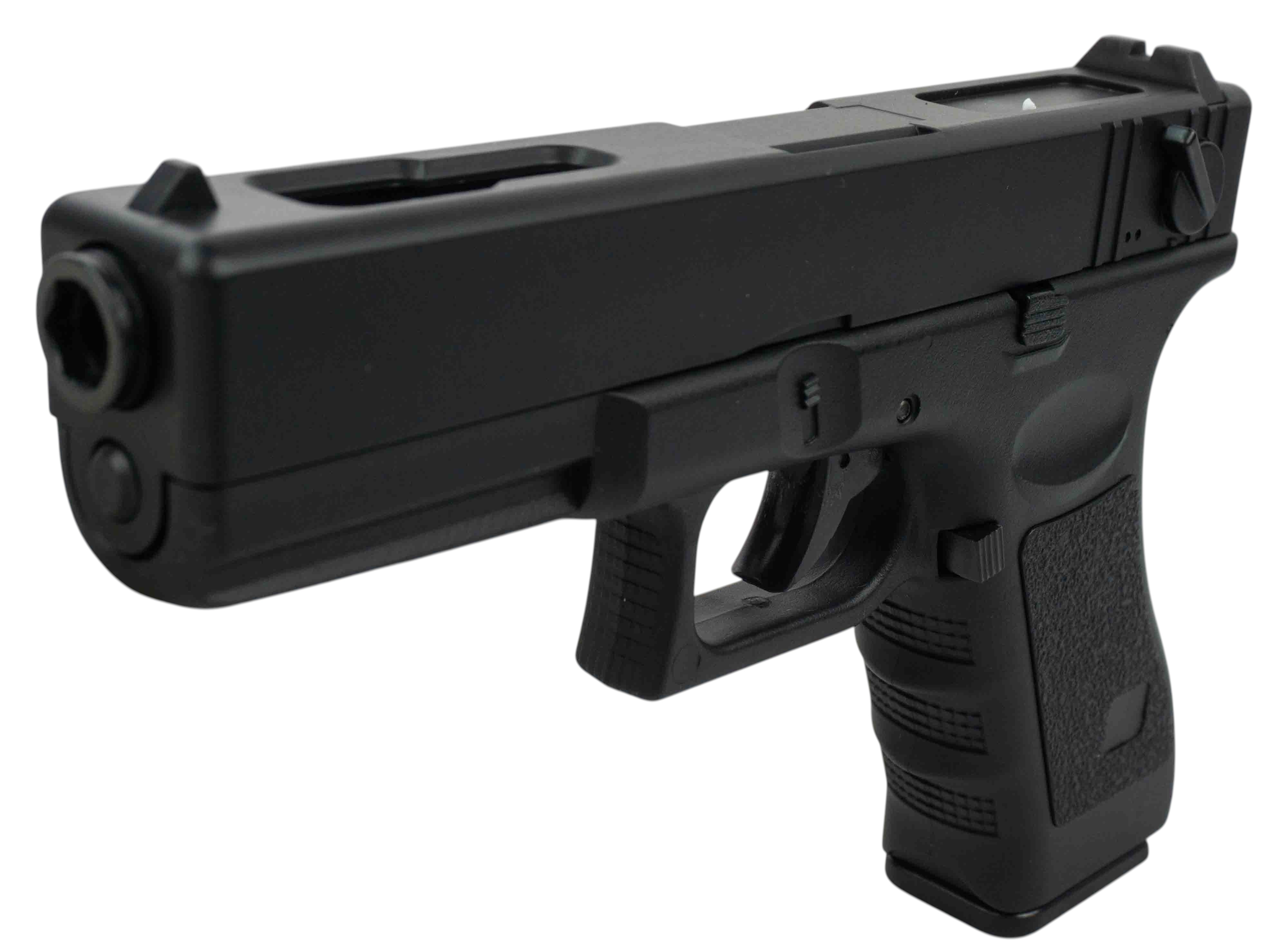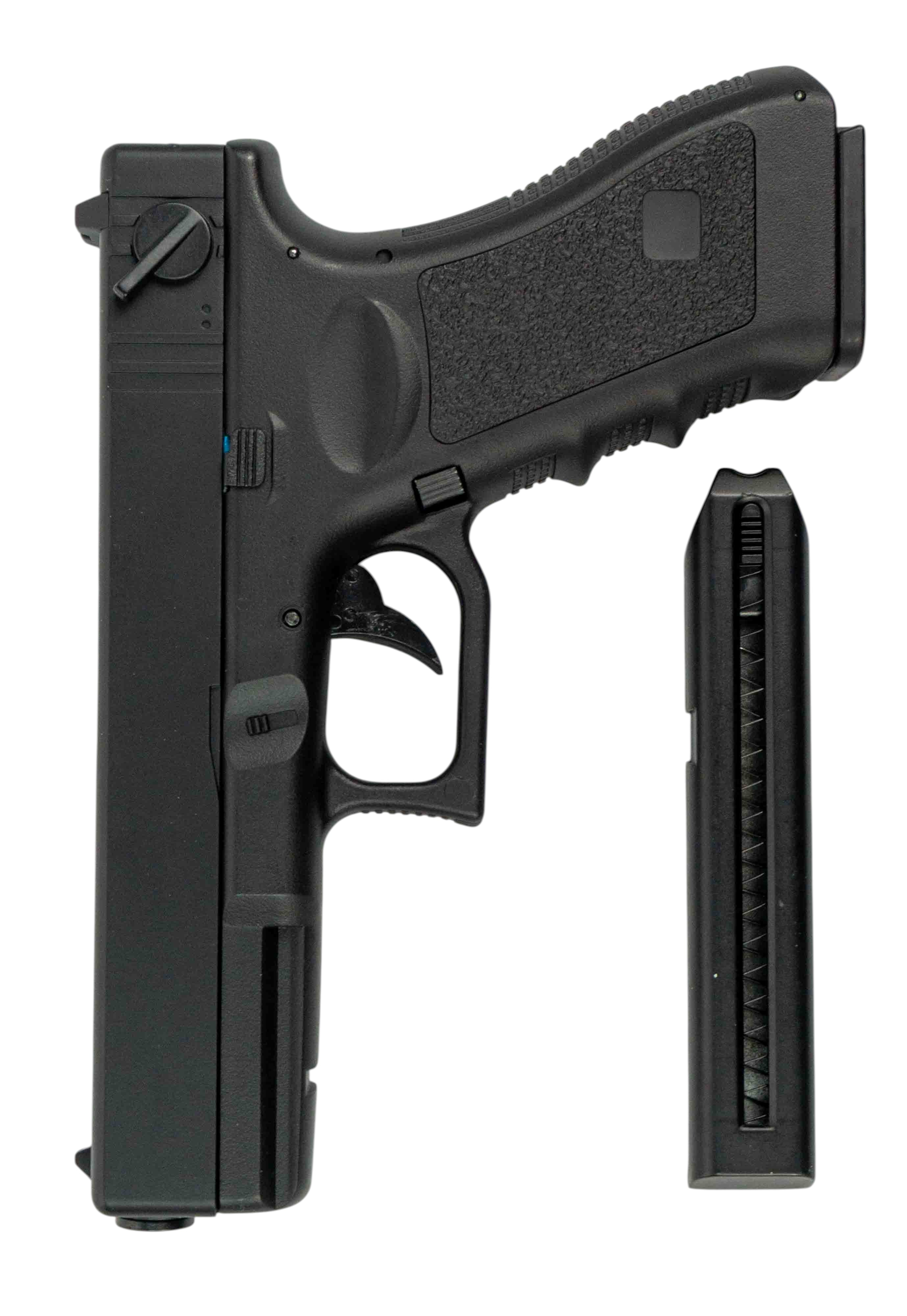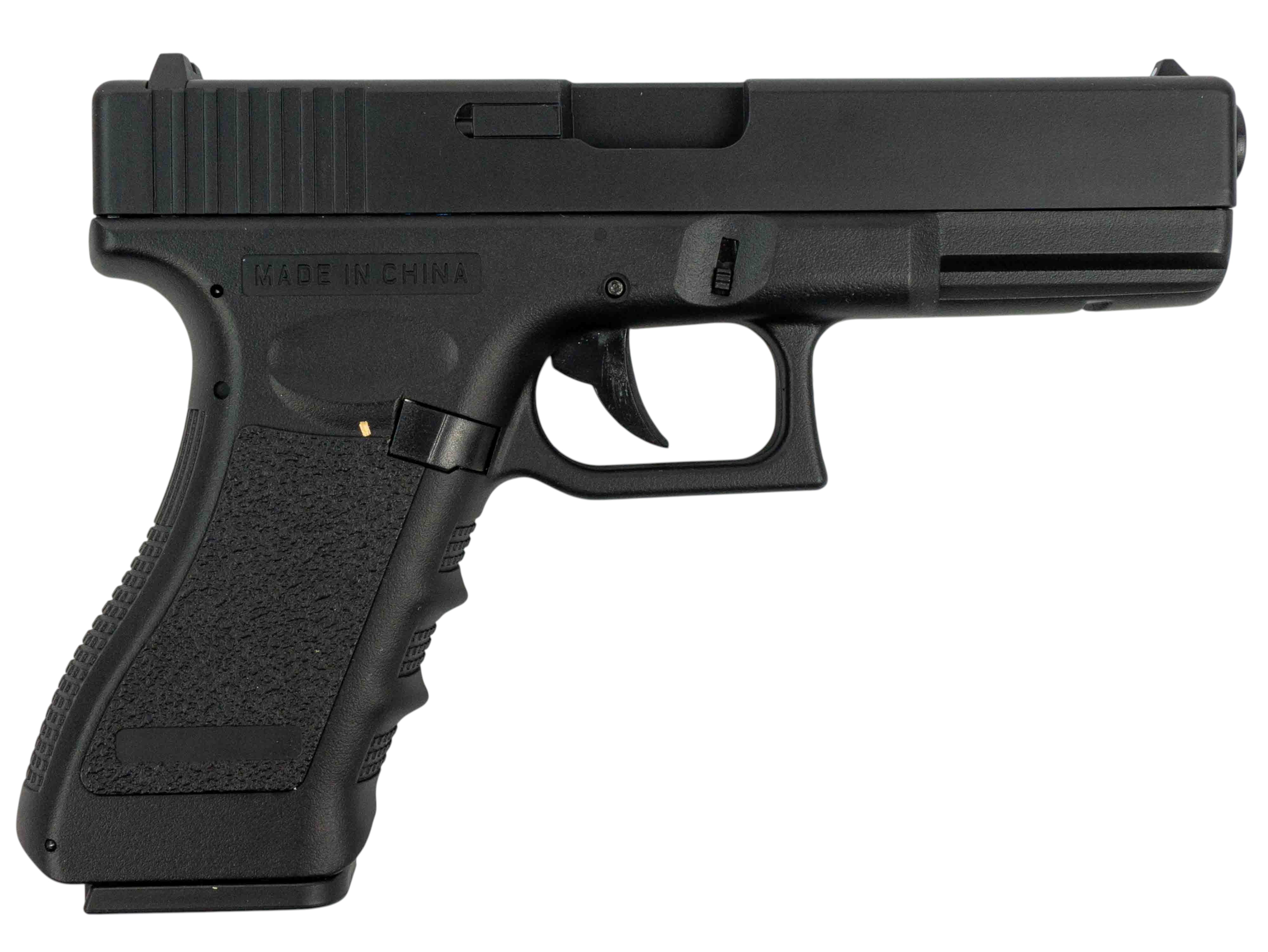 Модель пистолета Glock (Глок) от китайской фирмы Cyma (артикул cm030) выполнена из ударопрочного ABS пластика. В руке пистолет лежит хорошо благодаря удобной рукоятке. Вес равен оригинальному Glock 18 без патронов. Габариты довольно компактные, выступающих частей практически нет, поэтому пистолет не цепляется за одежду.