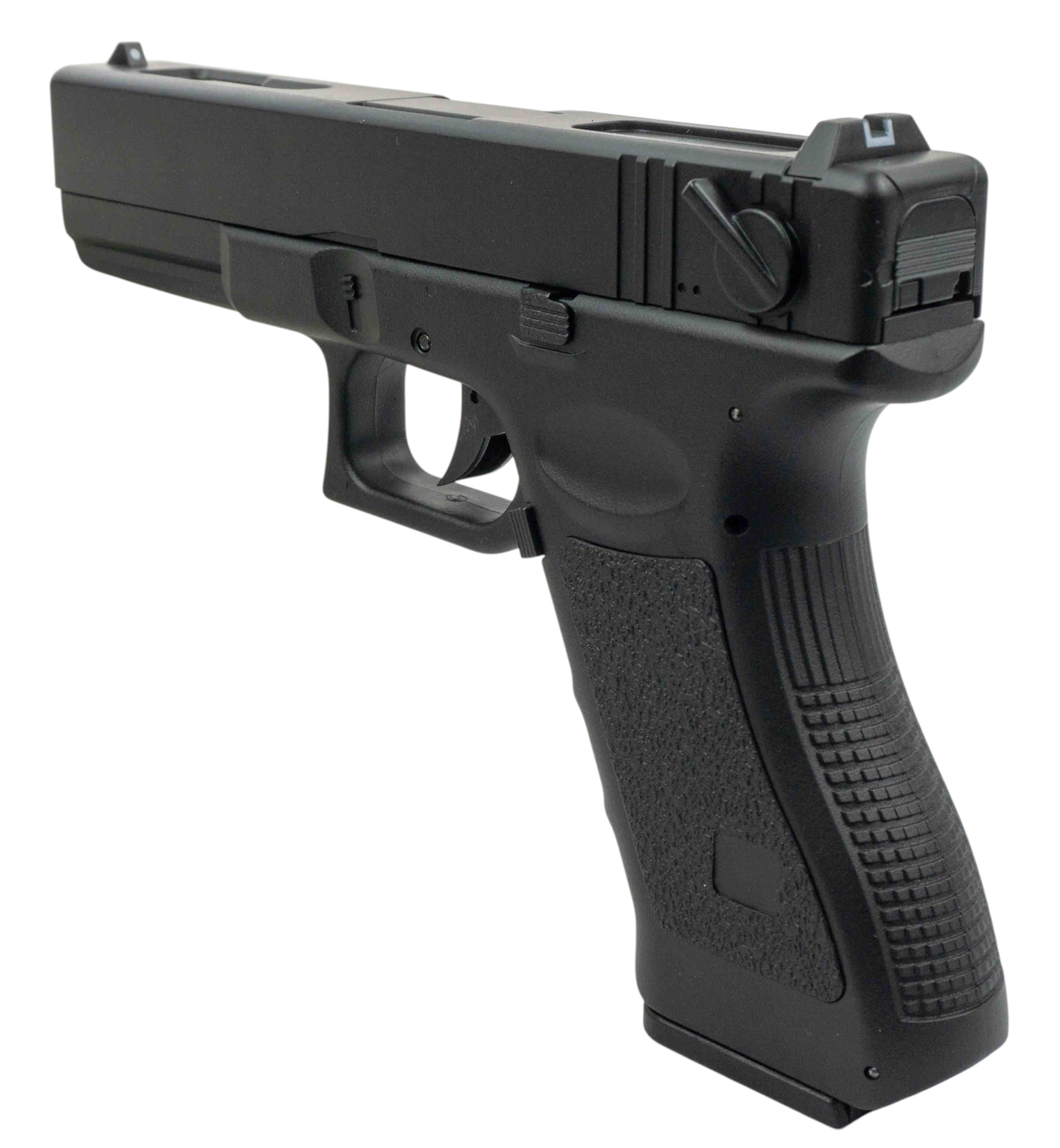 Прицельные приспособления постоянные, нерегулируемые. Эффективная дальность стрельбы электро глока составляет 15-20 метров. В отличие от оригинала на спусковом крючке отсутствует выступающая скоба предохранителя. Переключатель режима стрельбы с одиночного на автоматический, находится на левой стороне затворной рамы, и может быть переключён большим пальцем правой руки. Кнопка извлечения магазина находится на рукоятке, также с левой стороны. Для неполной разборки пистолета нужно нажать кнопку фиксации на тыльной стороне затворной рамы, и потянуть её вверх.