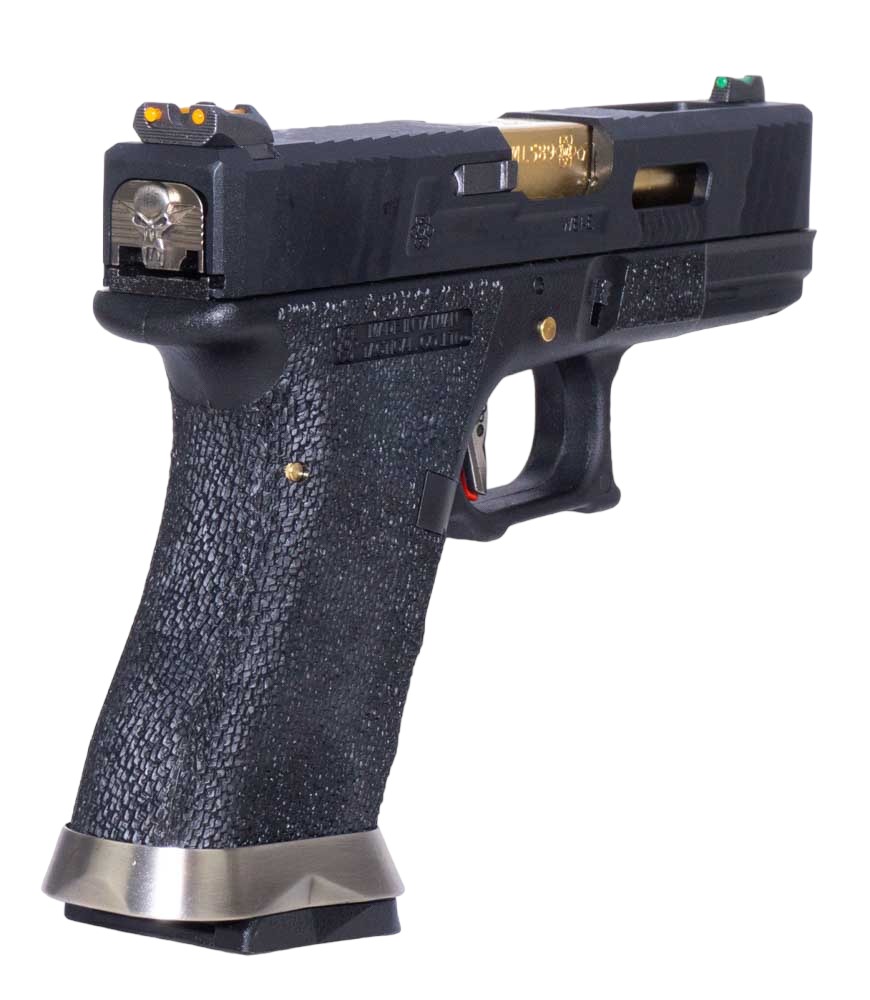 Страйкбольный пистолет от компании WE выполнен на базе боевого прототипа Glock 19. Данный пистолет стал излюбленным оружием среди полицейских и гражданских стрелков, за счет компактных размеров, удобства эксплуатации и огневой мощи.