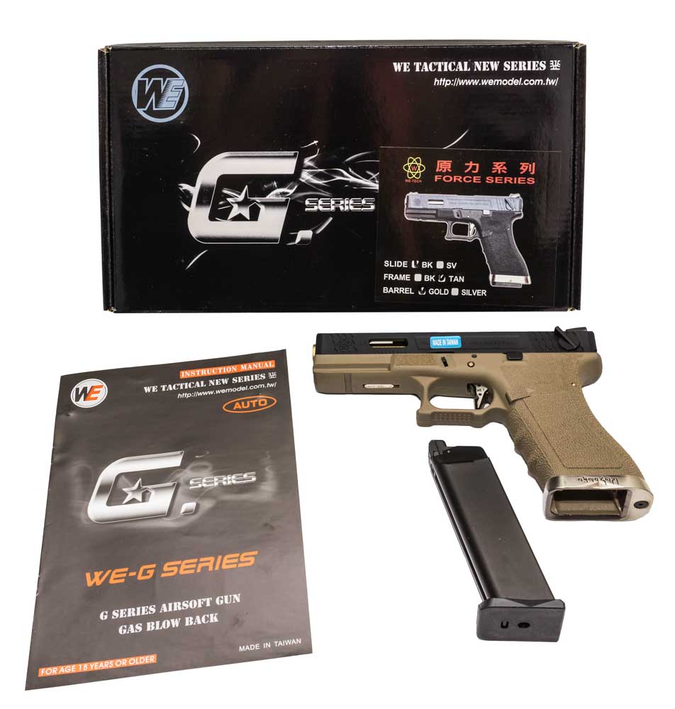 Страйкбольный пистолет Glock 18 G-Force от компании производителя WE Airsoft. Данное изделие представляет собой реплику австрийского самозарядного бескуркового пистолета Glock 18. Представленная модель обладает рядом особенностей, среди которых можно выделить наличие автоматического режима огня, агрессивные элементы экстерьера, более удобную рукоять и наличие направляющей для установки ЛЦУ и Тактических фонарей.
