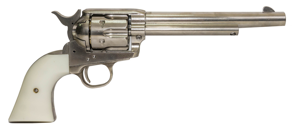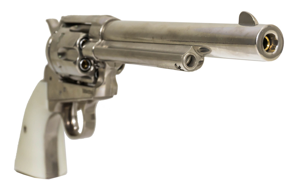 Американская легенда – револьвер Colt Peacemaker, в точности воспроизведенный тайваньской фирмой King Arms. Корпус револьвера полностью выполнен из алюминиевого сплава, крепко сбит и приятно сидит в руке благодаря полимерным накладкам на рукояти. Хромированное покрытие выглядит очень эффектно и в лучших традициях героев американских вестернов. Пистолет питается грингазом через заправочный клапан в рукоятке. Очень выигрышно смотрится за счет проработки мелких деталей, включая заводские маркировки и имитацию нарезов на внешнем стволе. Внутренний латунный стволик имеет диаметр 6.03мм, что обеспечивает хорошую точность и кучность при стрельбе. Механика работы изделия в точности повторяет боевой револьвер, можно заряжать шеллы отдельно, либо использовать отверстие для зарядки в самом барабане, имитируя заряжание настоящего кольта и наслаждаясь четкими щелчками барабана. Один шелл вмещает до 6-ти шариков. Револьвер комплектуется 6-ю шеллами.
