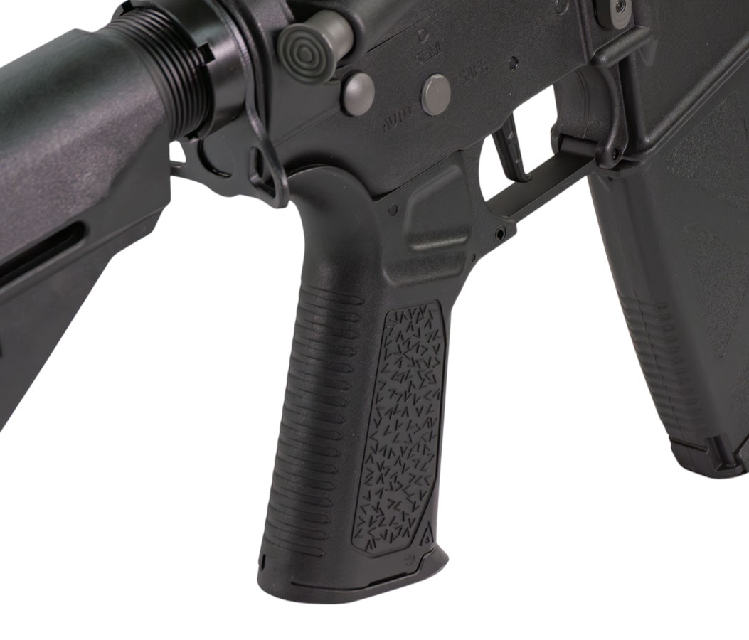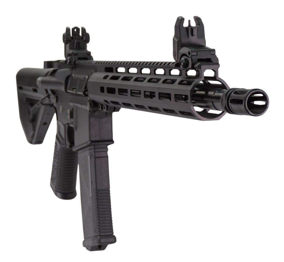 Корпус автомата выполнен из прочного нейлонового волокна — лёгкого, ударостойкого материала, который не боится интенсивных нагрузок. Цевьё длиной 12.2 дюйма, выполненное из металлического сплава, имеет интерфейс M-LOK и плавно переходит в верхнюю планку Пикатинни, что позволяет легко установить прицелы, фонари, ЛЦУ, рукояти и блоки управления огнём. Всё жёстко зафиксировано, без люфтов.