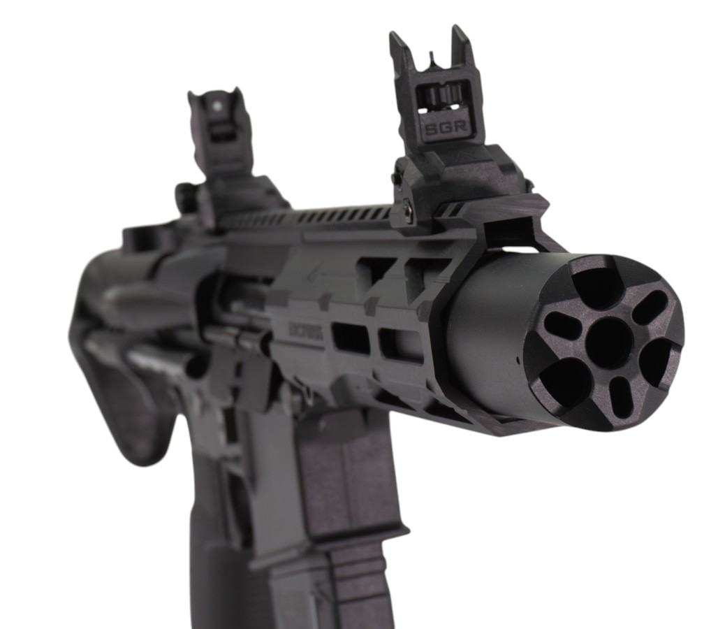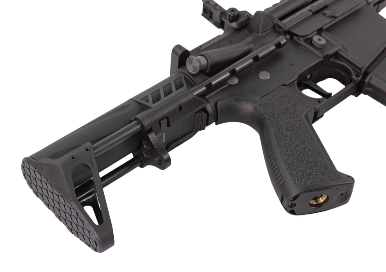 Внутри установлен гирбокс версии 2 с возможностью быстрой замены пружины, а управление стрельбой осуществляется через продвинутую электронную контактную группу с защитным MOSFET-ключом. Настройки позволяют выбрать один из пяти режимов огня, включая одиночный, отсечку по два или три выстрела, парный и непрерывный автоматический огонь. Также доступна регулировка предварительного взвода пружины, уровня активного торможения, индикации разряда аккумулятора и сброса к заводским параметрам. Всё программируется через селектор огня.