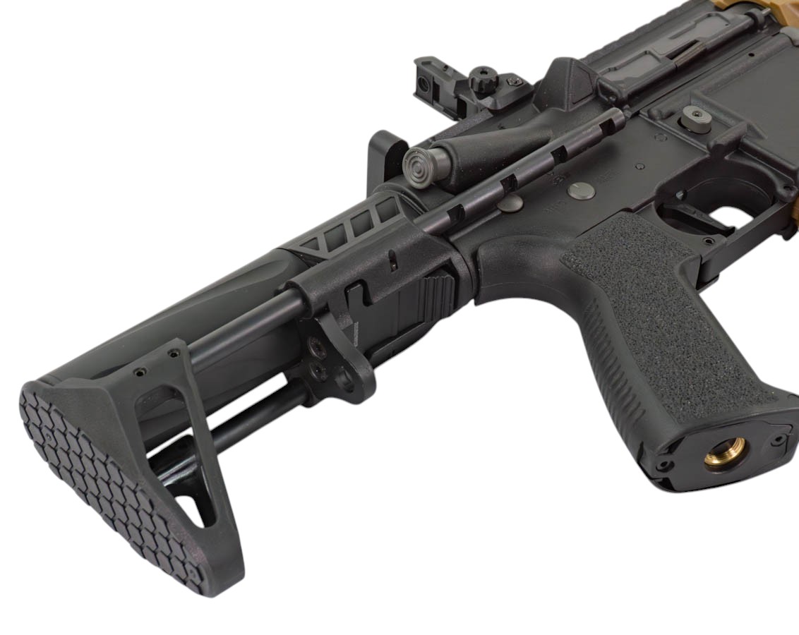 Внутри установлен гирбокс версии 2 с возможностью быстрой замены пружины, а управление стрельбой осуществляется через продвинутую электронную контактную группу с защитным MOSFET-ключом. Настройки позволяют выбрать один из пяти режимов огня, включая одиночный, отсечку по два или три выстрела, парный и непрерывный автоматический огонь. Также доступна регулировка предварительного взвода пружины, уровня активного торможения, индикации разряда аккумулятора и сброса к заводским параметрам. Всё программируется через селектор огня.