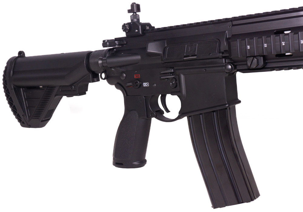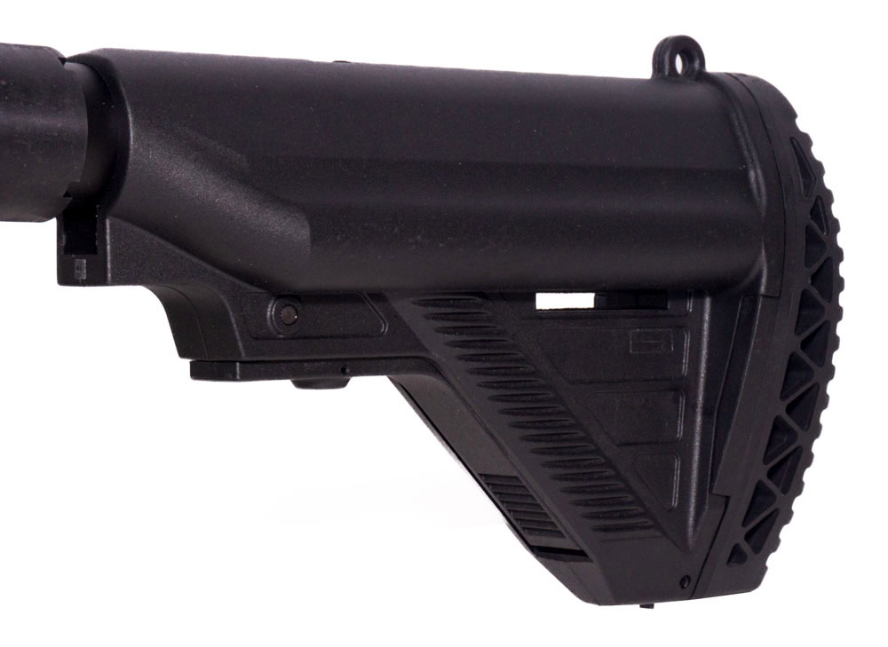 Особенностью данного привода можно отметь телескопический приклад имеющий 3 положения. Вы можете отрегулировать его по длине рук. Кнопка сброса магазина и кнопка закрытия шторки Хоп-апа расположены по бокам ресивера GR16, таким образом автомат будет одинаково удобен как левшам, так и правшам.