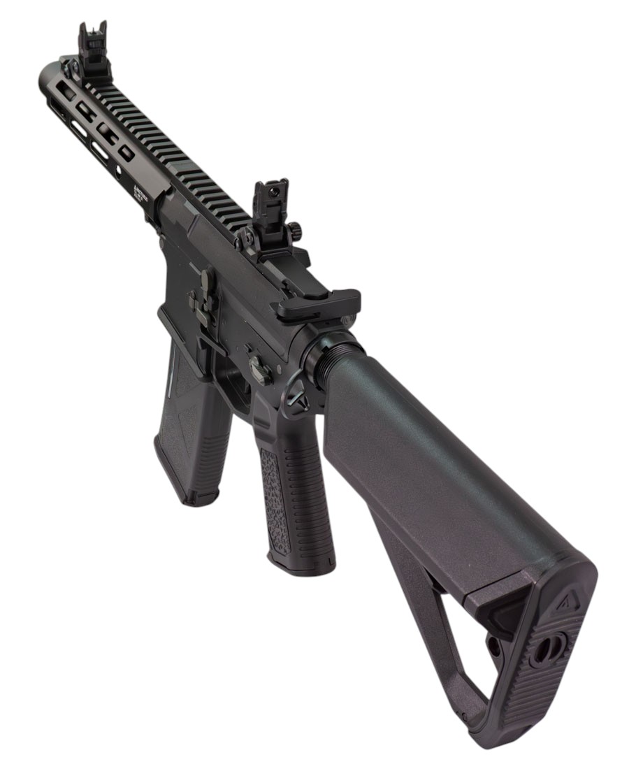 Цевьё длиной 8 дюймов выполнено из металла и оснащено современным M-Lok-интерфейсом, а также планкой Пикатинни по всей верхней проекции. Это обеспечивает широкие возможности для установки оптики, ЛЦУ, рукоятей и других тактических аксессуаров. В прикладе установлен T-коннектор, куда размещается аккумулятор. Шестипозиционный приклад позволяет подстроить длину автомата под особенности игрока или задачи на поле.