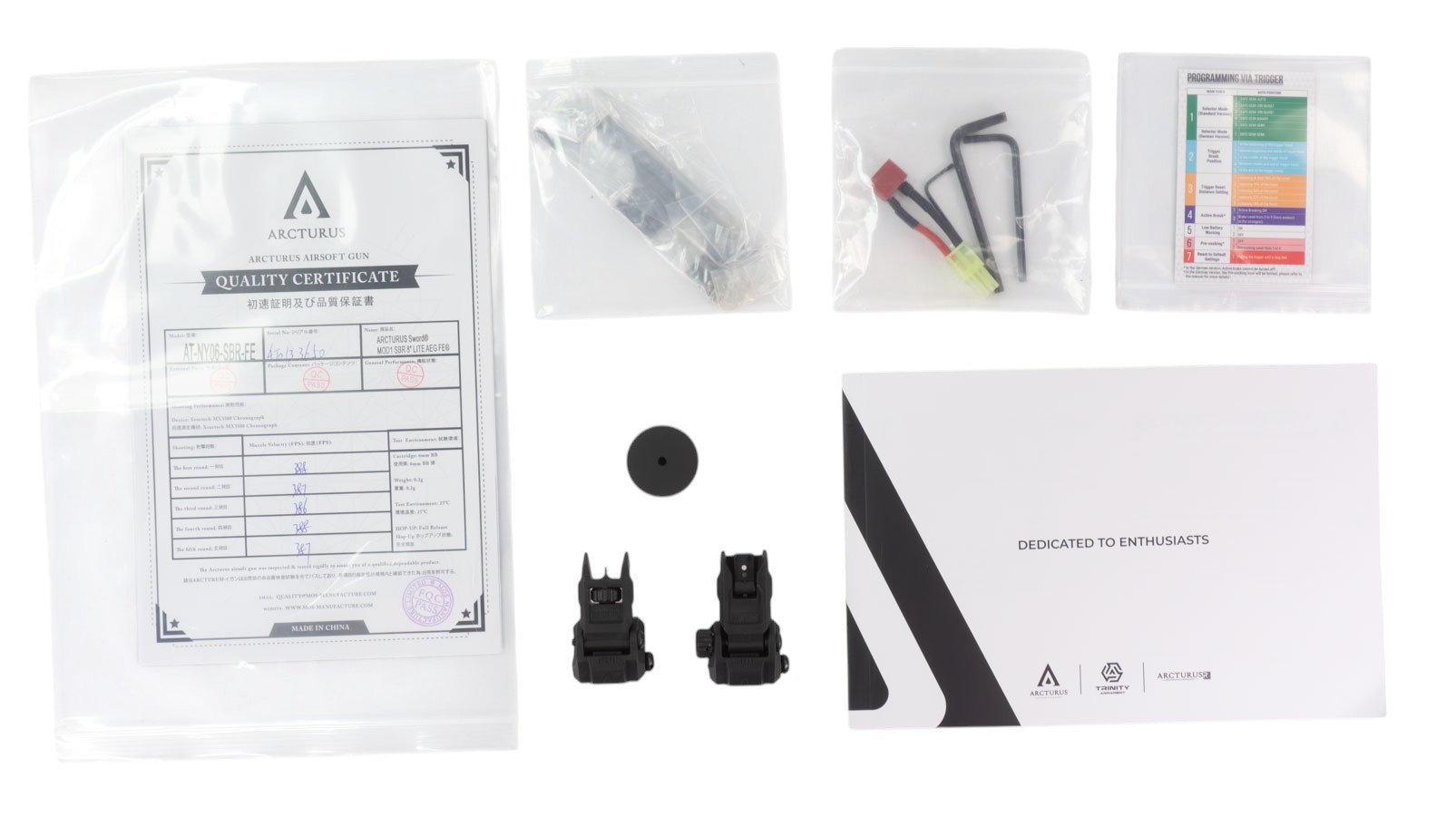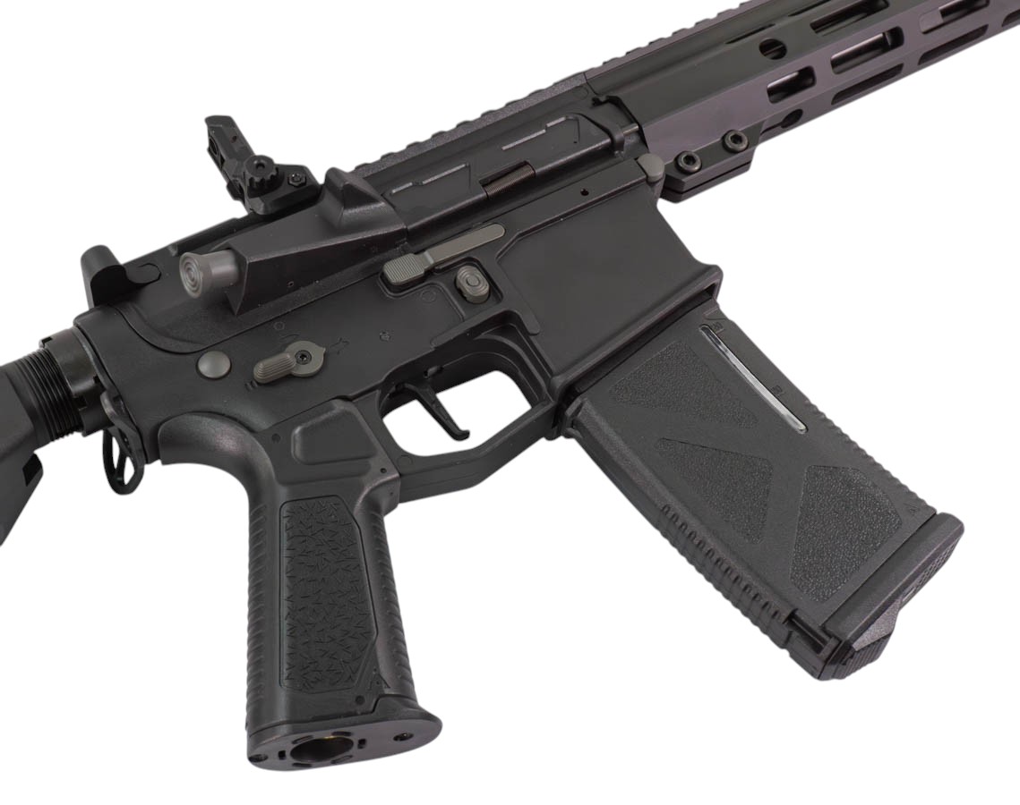Внутри установлен гирбокс версии V2 с быстрой заменой пружины и улучшенной контактной группой FE ETU. Электроника поддерживает пять режимов огня: одиночный, отсечка по 2 и 3 выстрела, парный выстрел и автомат. Также доступна тонкая настройка чувствительности спуска, активного торможения, предварительного взвода пружины и индикации разряда аккумулятора. Все параметры настраиваются через селектор огня.
