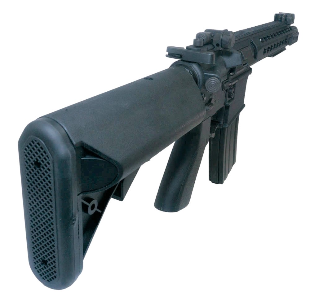 Страйкбольная винтовка М4 оборудована 6-ти позиционным телескопическим прикладом по типу Крейн-сток. Для регулировки необходимо утопить фиксатор в теле приклада. У основания трубы приклада имеется двухсторонняя стальная антабка, позволяющая установить оружейный ремень как под правую, так и под левую руку. Также, на самом прикладе имеются две щелевые антабки, позволяющие продеть оружейный ремень.