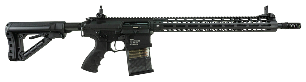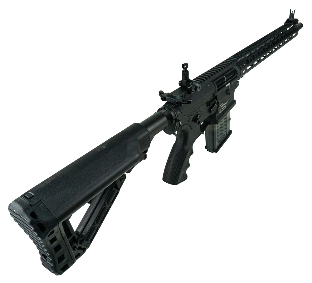 Автомат G&G TR16 MBR 308 M-LOK является волной вариацией винтовки SR25 от компании Knight’s Armament Company. Отличительными чертами этого привода является M-LOK цевьё, и новый оригинальный гирбокс G2 созданный компанией G&G. Весит 3170 грамм, имеет габариты с раздвинутым прикладом в 103 см, а со сложенным в 93,5 см. Ствольная коробка, ствол и цевье типа м-лок сделаны из алюминиевого сплава, а рукоять и приклад из ударопрочного ABS-пластика. Данная сборка привода отличается ещё и тем, что не люфтит. При движении затвора назад, открывается камера хоп ап. Что бы дополнительно обезопасить внутренности, имеется шторка затвора с рабочей задержкой.