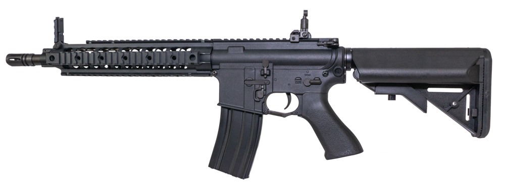Автомат Cyma SR-16E3 UX 11" представляет собой страйкбольную версию карабина SR-16E3 от Knights Armament. Оснащен телескопическим прикладом, который упрощает транспортировку и ведение боя в условиях замкнутых пространств (длина составляет 855/770 мм). Привод весит около 2,2 кг. Достичь такого легкого веса удалось за счет использования при изготовлении большинства элементов корпуса нейлона (легче и крепче пластика). Цевье является репликой URX от Knights Armament и оснащено 4 планками стандарта Picatinny (по одной с каждой из сторон). Это позволит установить внешний обвес (например, тактическую рукоять, ЛЦУ, фонарик и т.п.). Наверху планка пикатинни продолжается от цевья по всей длине ресивера. За счет этого можно использовать оптические или коллиматорные прицелы. Штатное прицельное приспособление съемное и складное. Причем мушка является частью самой планки Picatinny (в сложенном состоянии). Защитная скоба спускового крючка предоставляет достаточно пространства для использования привода в перчатках. Кроме того, Cyma SR-16E3 оснащен электронным ключом MOSFET, который обеспечит более длительную службу внутренним компонентам, а также позволит установить более мощную пружину. Для доступа к отсеку для АКБ необходимо снять тыльник приклада (АКБ и ЗУ идут в комплекте). На нем же расположены прорези для установки тактического ремня (также имеется антабка у основания приклада). Данный привод будет удобен для использования на ближних и средних дистанциях, а также обеспечит комфортную стрельбу и переноску в течение длительного времени.