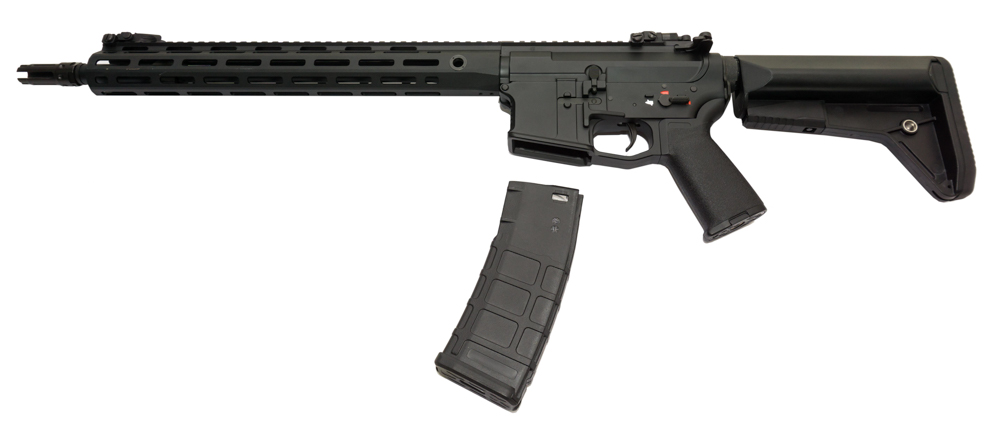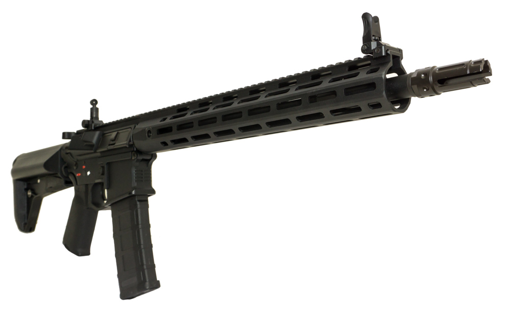 Карабин Cyma CM097 из серии Platinum является новым витком эволюции приводов от компании Cyma. Фундаментальными отличительными особенностями являются наличие ключа Mosfet с контактной группой на микропереключателе и возможности быстрой замены пружины без извлечения гирбокса из ствольной коробки. Данные функции позволяют сделать работу электроники привода более стабильной и надежной и сильно упростить процесс изменения мощности привода для различных игровых площадок. Кроме того микропереключатель делает спуск очень быстрым и плавным, что по достоинству оценят игроки, часто играющие на одиночном режиме огня. Сам привод имеет телескопический приклад типа LMT, современный ресивер по мотивам VLTOR и легкое и ухватистое цевье с интерфейсом M-LOK. На прикладе и цевье предусмотрены слоты для QD-антабок. Привод построен на базе гирбокса второй версии, начальная скорость полета шара массой 0.2г составляет 120 м\с. Верхняя часть ресивера и цевья имеют интерфейс пикатинни, что позволит установить массу всевозможных аксессуаров и прицельных приспособлений. Механические мушка и целик откидываются, их можно сложить при использовании оптики или коллиматоров. Привод комплектуется механическим магазином типа P-Mag.