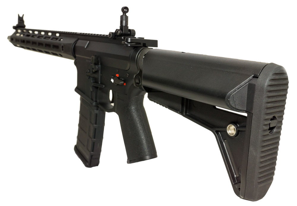 Привод cm097 обладает рядом особенностей, среди них 14,5 дюймовое цевье (около 37см) с интерфейсом M-LOK. Такой интерфейс повышает удобство при пользовании за счет отсутствия планок пикатинни снизу и по бокам. Так же на приводе установлен шести позиционный приклад типа crane stock.