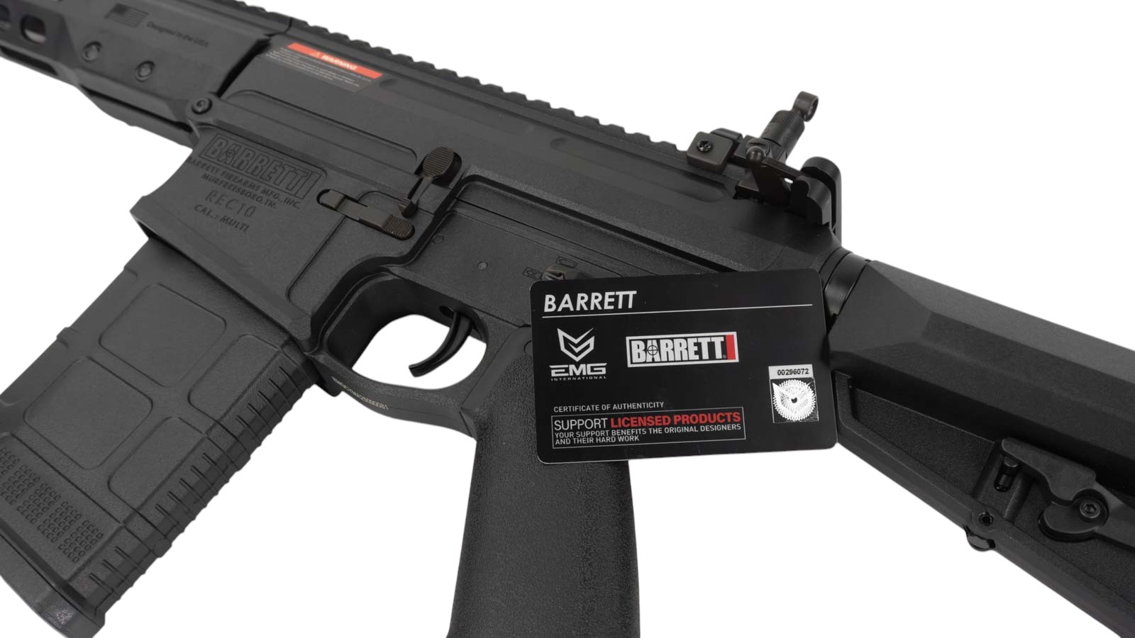 Страйкбольная автоматическая винтовка Barrett REC10 от производителя CYMA — высококачественная реплика винтовки Barrett REC10 под калибр 7,62 мм от той самой американской компании по производству стрелкового оружия Barrett Firearms Manufacturing. Дизайн модели полностью лицензирован компанией-производителем оригинальной винтовки, что подтверждается наличием маркировок на корпусе изделия.