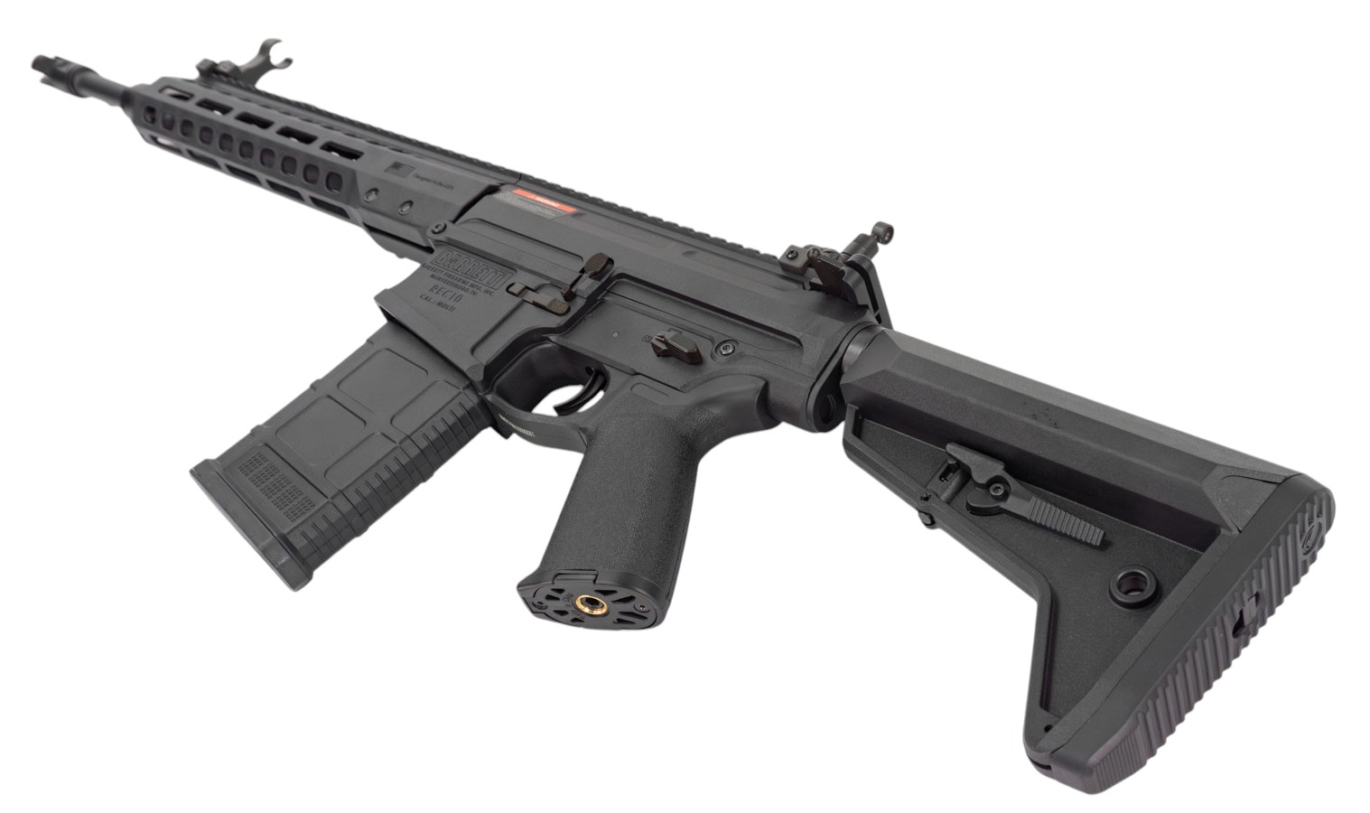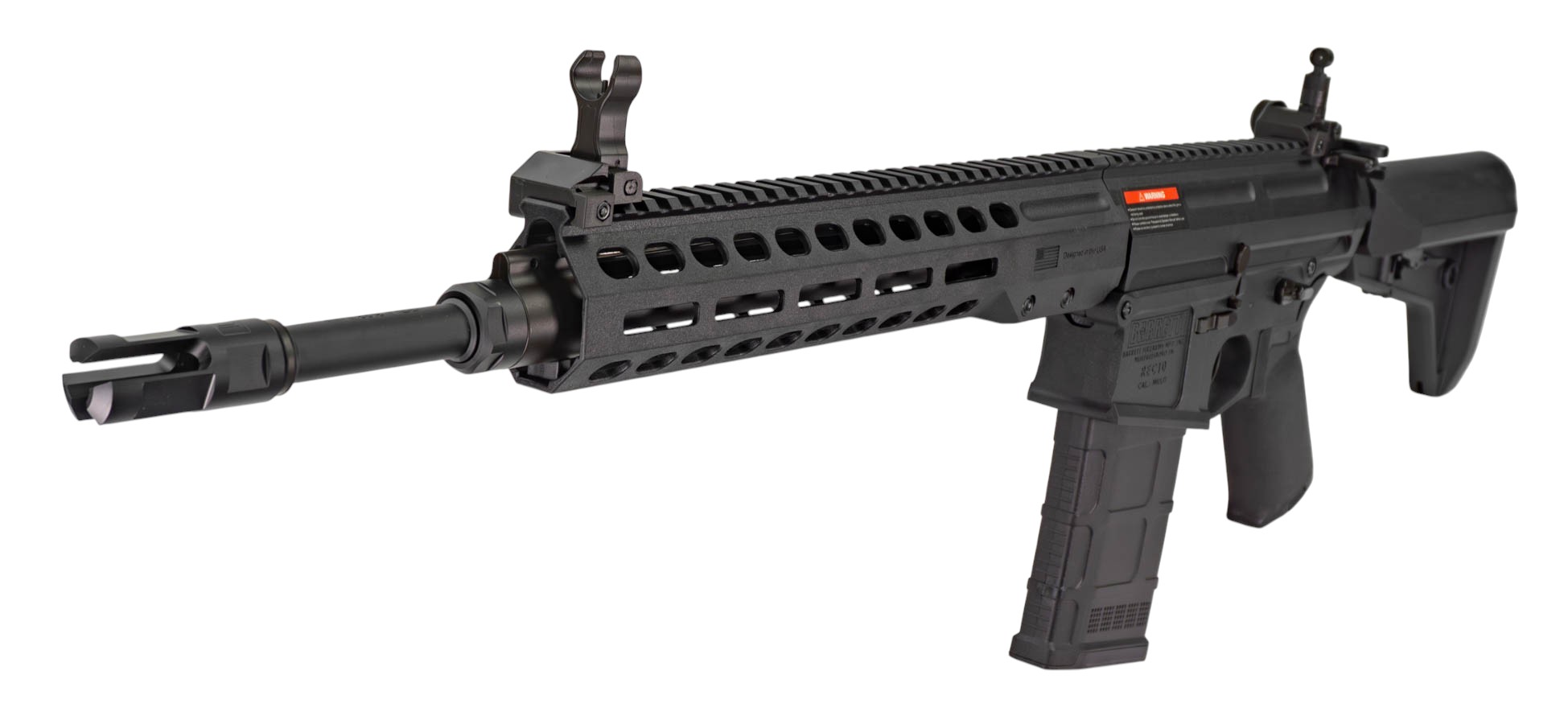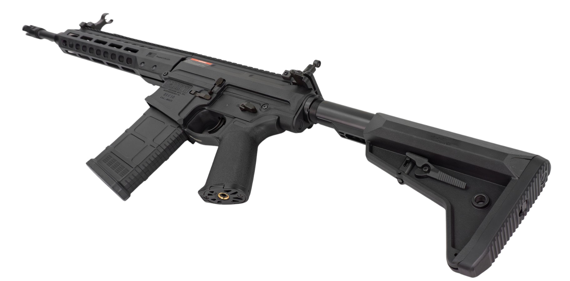 Большая часть привода изготовлена из прочного нейлона, что обеспечивает небольшой вес конструкции при сохранении достаточной прочности для интенсивного использования. Cyma Barrett REC10 имеет цевьё, оснащённое системой крепления M-Lok, что позволяет устанавливать различные тактические обвесы от сошек до ЛЦУ. Вдоль верхней части модели предусмотрена планка Пикатинни для возможности замены штатных прицельных приспособлений на оптику или добавления иных примочек. Телескопический приклад позволяет настроить упор плеча под себя, а наличие прорезиненного затыльника делает упор ещё и удобнее. Благодаря резьбе ствола -14 мм на привод можно устанавливать трассерные насадки или ДТК.