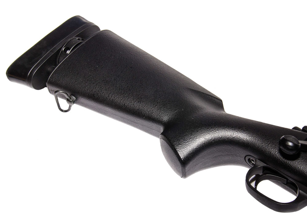 Спринговый механизм винтовки взводится вручную перед каждым выстрелом, как и у реального прототипа – отводом продольно-скользящего затвора в крайнее заднее положение. С правой стороны на шейке ложи расположен предохранитель. Начальная скорость выстрела шаром 0.2 гр в базе составляет около 150 м/с. Для крепления оружейного ремня на ложе расположены две металлические антабки. Вместимость механического магазина составляет 28 шаров.
