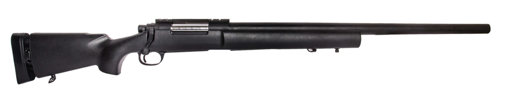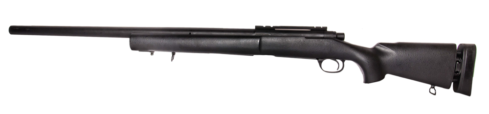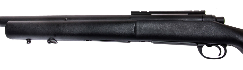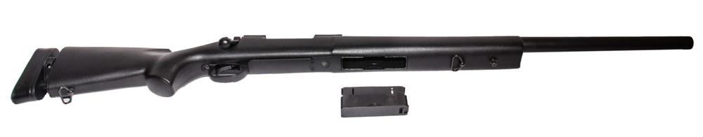 Спринговая винтовка CM702 от Cyma – страйкбольная реплика одноименной снайперской винтовки M24 продольно-скользящим затвором, которая состоит на вооружении Армии США. Винтовка изготовлена из ударопрочного пластика (ложа и приклад) и металла (внешний ствол, затвор). Внешние детали окрашены в черный цвет. Корпус винтовки при необходимости быстро разбирается на две части для удобной транспортировки – для этого необходимо выкрутить два болта и крепление сошек, расположенные с нижней стороны в ложе. Винтовка M24 в базе не имеет механических прицельных приспособлений, но оснащена направляющей пикатинни для установки оптического прицела. Так же винтовка имеет антабку крепления сошек и регулируемый по длине приклад. В комплект поставки входит переходник для установки глушителя с резьбой 14мм, который устанавливается на дульный срез внешнего ствола.