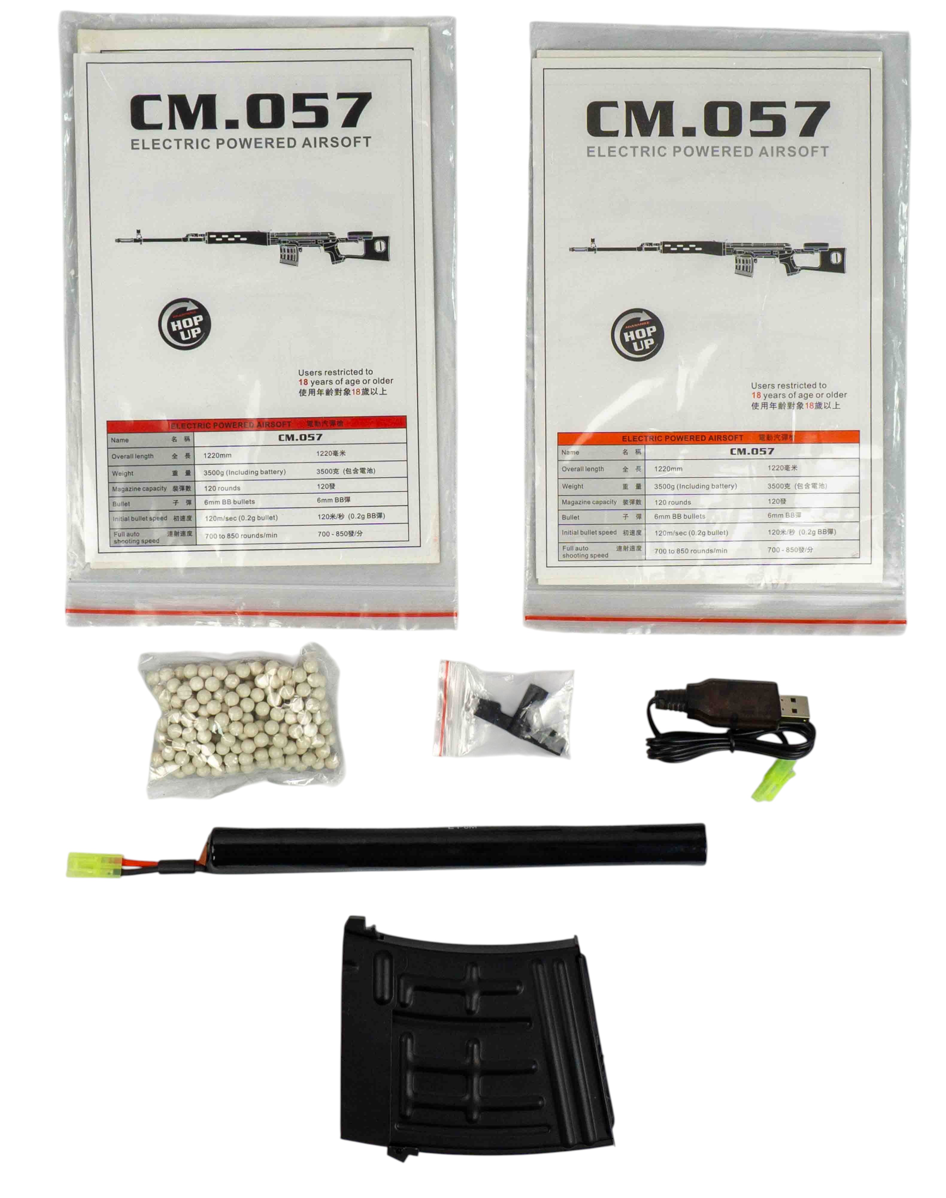 Базовая комплектация модели включает привод, бункерный магазин (200 шаров), шомпол, зарядное устройство и Ni-Mh аккумулятор.