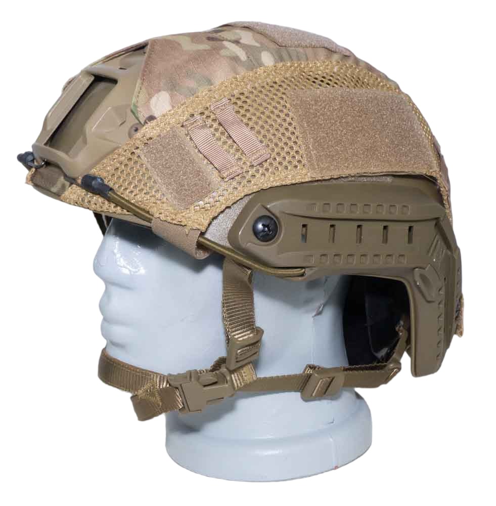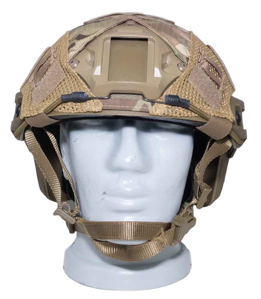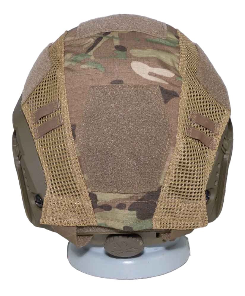 Тканевый чехол производства компании Kingrin, предназначенный для установки на шлемы Ops-Core FAST и их реплики. Чехол повышает маскировочный свойства шлема, так как скрывает поверхность от солнечных бликов, позволяет подобрать нужный камуфляж, а так же немного «ломает» силуэт шлема за счет мешковатости тканевого чехла. Боковые части чехла выполнены из сетчатой ткани. Установлено несколько ячеек для крепления дополнительной маскировки (трава, ветки), либо фиксации проводов доп. оборудования. На шлем нашито несколько панелей велкро, которые могут быть использованы для установки нашивок или небольшого навесного оборудования на липучке. Чехол не закрывает переднее крепление для ПНВ и боковые направляющие ARC.