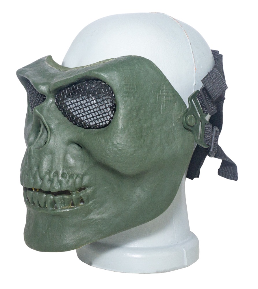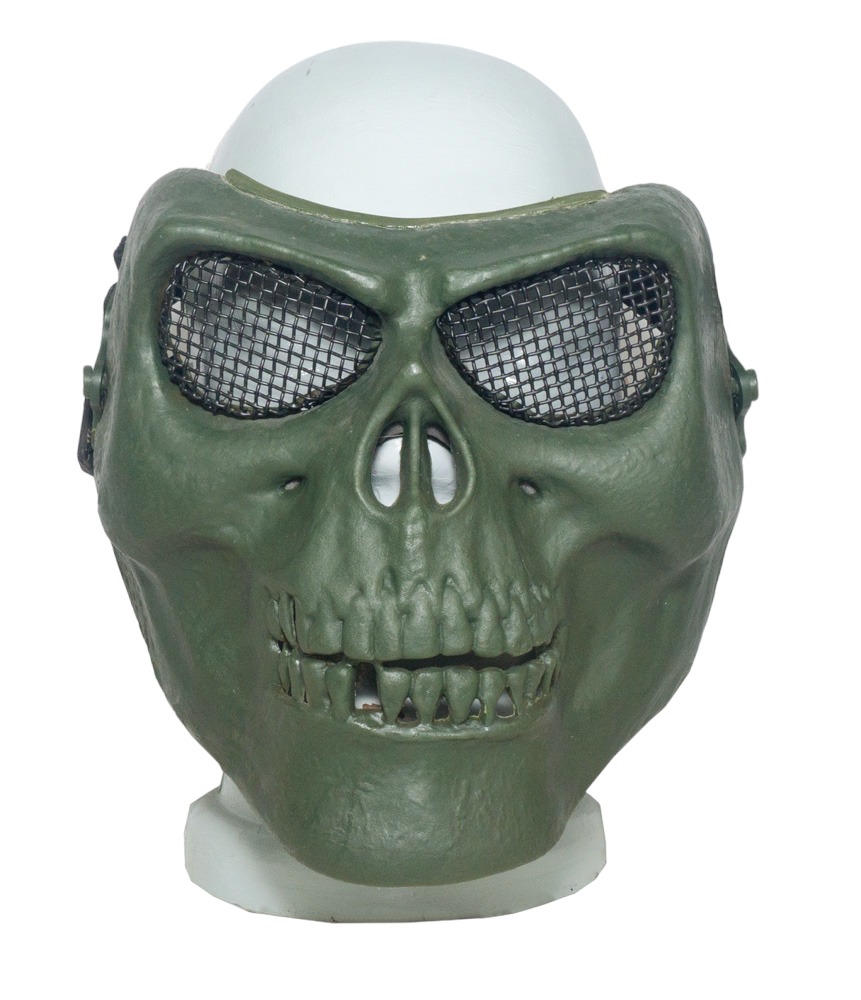 Страйкбольные маски в виде черепа являются популярным выбором среди игроков в страйкбол. Они добавляют устрашающий внешний вид и выделяют вас на фоне других бойцов. Представленная модель изготовлена из ударопрочного пластика и металла. Так из металла выполнена сетка в области глаз, а из пластика корпус маски. На изделие имеются регулируемые ремешки, предназначенные для плотной фиксации изделия на голове пользователя.
