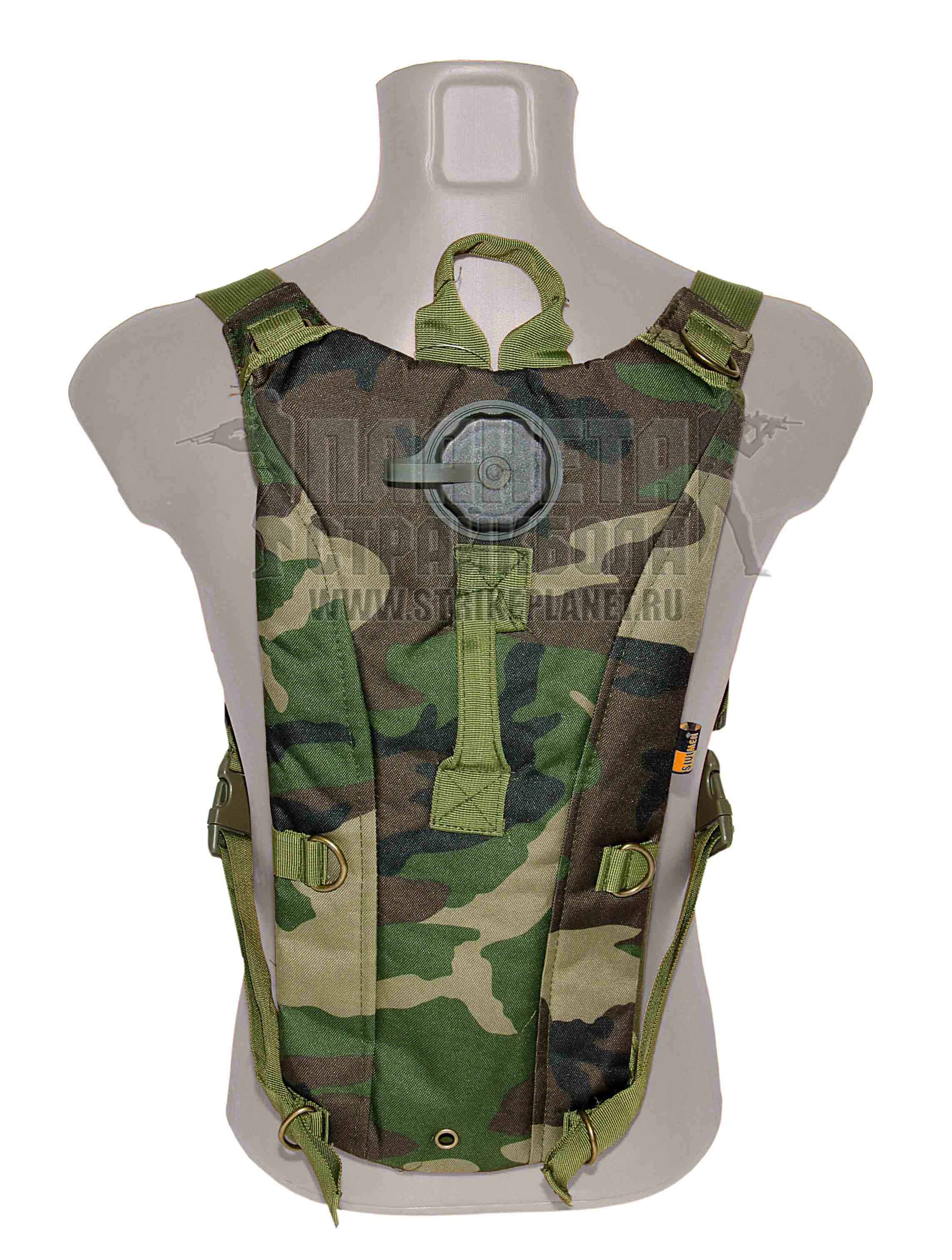 Данная питьевая система включает в себя специальный ранец для переноски и собственно сам гидратор (гидропак) – емкость для воды, рассчитанную на 3 литра. Ранец гидратора изготовлен из прочной ткани, устойчивой к истиранию и повреждениям. Слой ткани достаточно толстый для защиты уязвимого гидропака от повреждений. Плечевые лямки ранца имеют регулировку по длине, что позволяет подогнать его под людей разных габаритов, а длины лямок достаточно, чтобы носить гидратор поверх надетого бронежилета и разгрузочного жилета. Лямки имеют застежки фастексы, так что при необходимости ранец может быть быстро сброшен. Если отстегнуть их. Между собой плечевые лямки стягиваются грудным ремнем, который также застегивается на фастекс и имеет регулировку по длине. Ремень обеспечивает плотное прилегание ранца к телу, исключая его соскальзывание при активных передвижениях. На лямках и на самом ранце нашиты металлические D-кольца. Сегментированная спинка ранца с подкладом, повышает комфорт при ношении гидратора. С внешней стороны на ранец нашиты вертикальная и горизонтальная ручки для переноски. В нижней части ранца имеется металлическое отверстие – люверс, для слива попавшей внутрь воды.