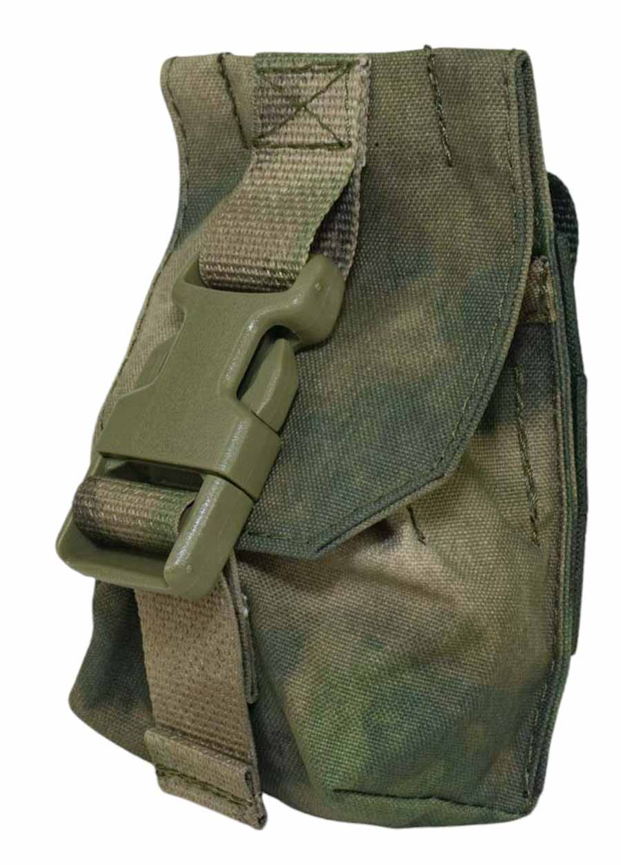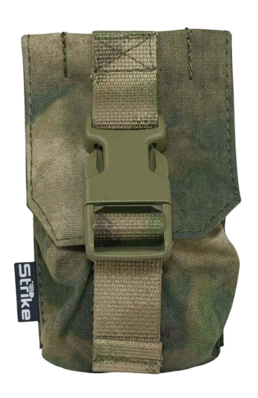 Гранатный подсумок Strike подойдет для использования с большинством типов гранат (например, РГД-5). Изделие выполнено из устойчивой к истиранию ткани, которая также обеспечит защиту от воздействия влаги (особенно полезно во время боя в плохих погодных условиях). Сам подсумок закрытого типа – т.е. закрывается на клапан с фастексом (фурнитура производителя Apri может выдерживать высокие нагрузки и обеспечит длительный срок службы). Такая компоновка защитит гранату от падения, надежно фиксируя ее внутри. В нижней части изделия также располагается люверс для отведения попавшей влаги. Подсумок Strike крепится на поясной ремень или на снаряжение с интерфейсом Molle.