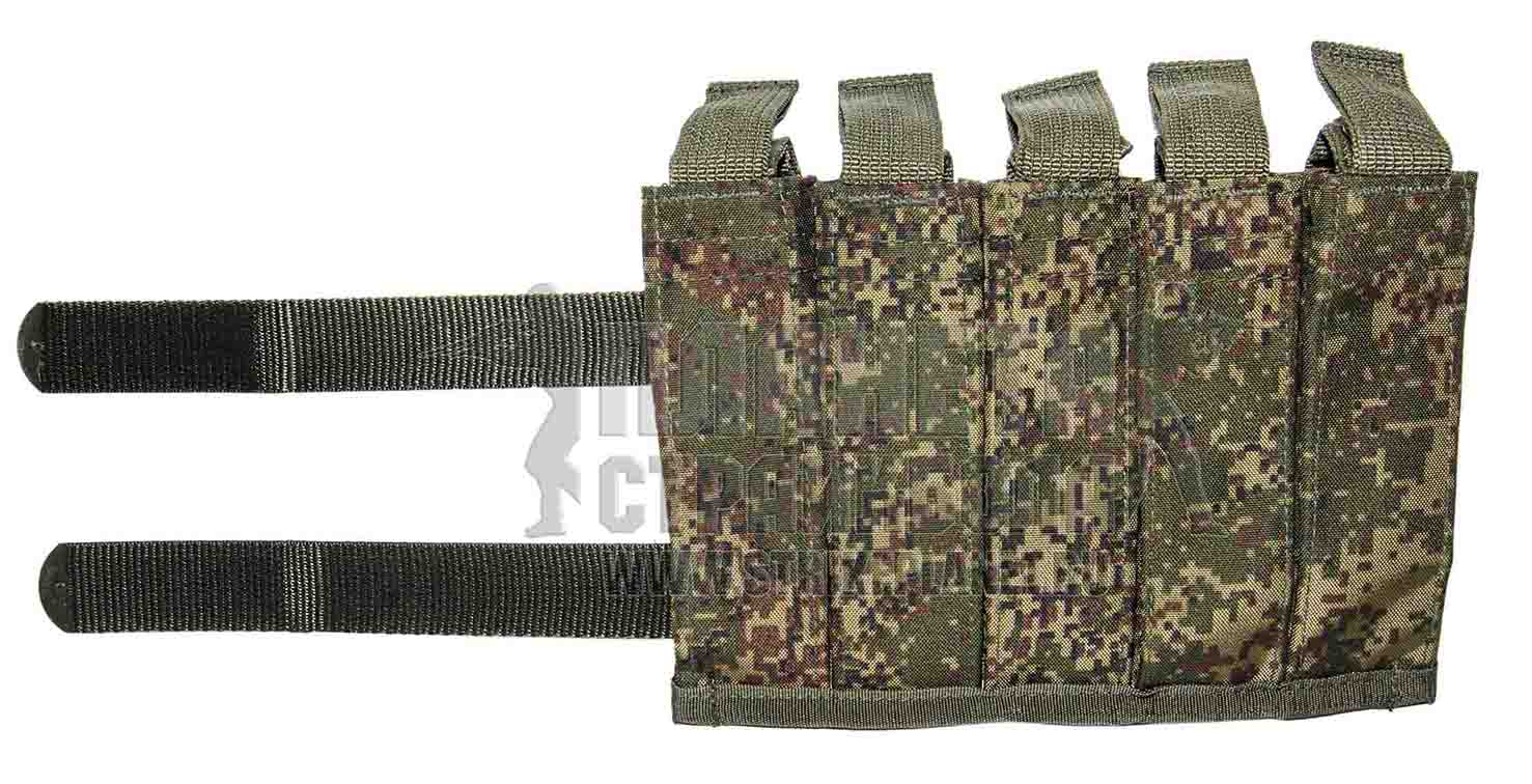 Подсумок для 5 выстрелов к подствольному гранатомету, производства компании Техинком. Такой подсумок входит в комплект поставки транспортных систем 6ш104, 6ш116 и аналогичных, которые состоят на вооружении Армии России. Данная модель предназначена для установки под левую руку, при размещении на снаряжении спереди, либо под правую, при установке на спине. Каждая из пяти ячеек подсумка застегивается на турникетную кнопку и имеет размер, достаточный для размещения подствольного выстрела любой длины. Фиксация подсумка на снаряжении происходит при помощи строп УМТБС – отечественного аналога крепления MOLLE. Изготовлен подсумок из прочной износостойкой ткани.