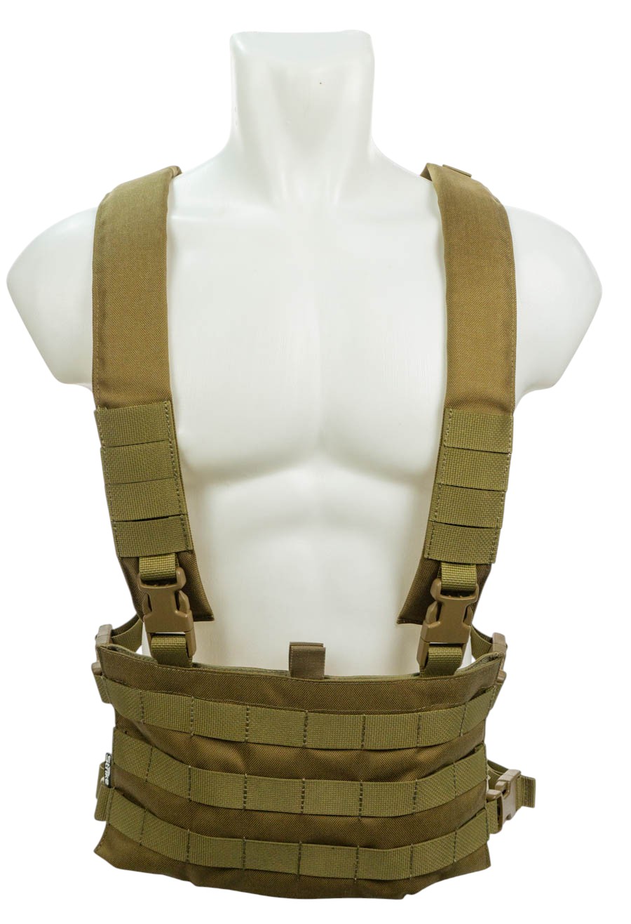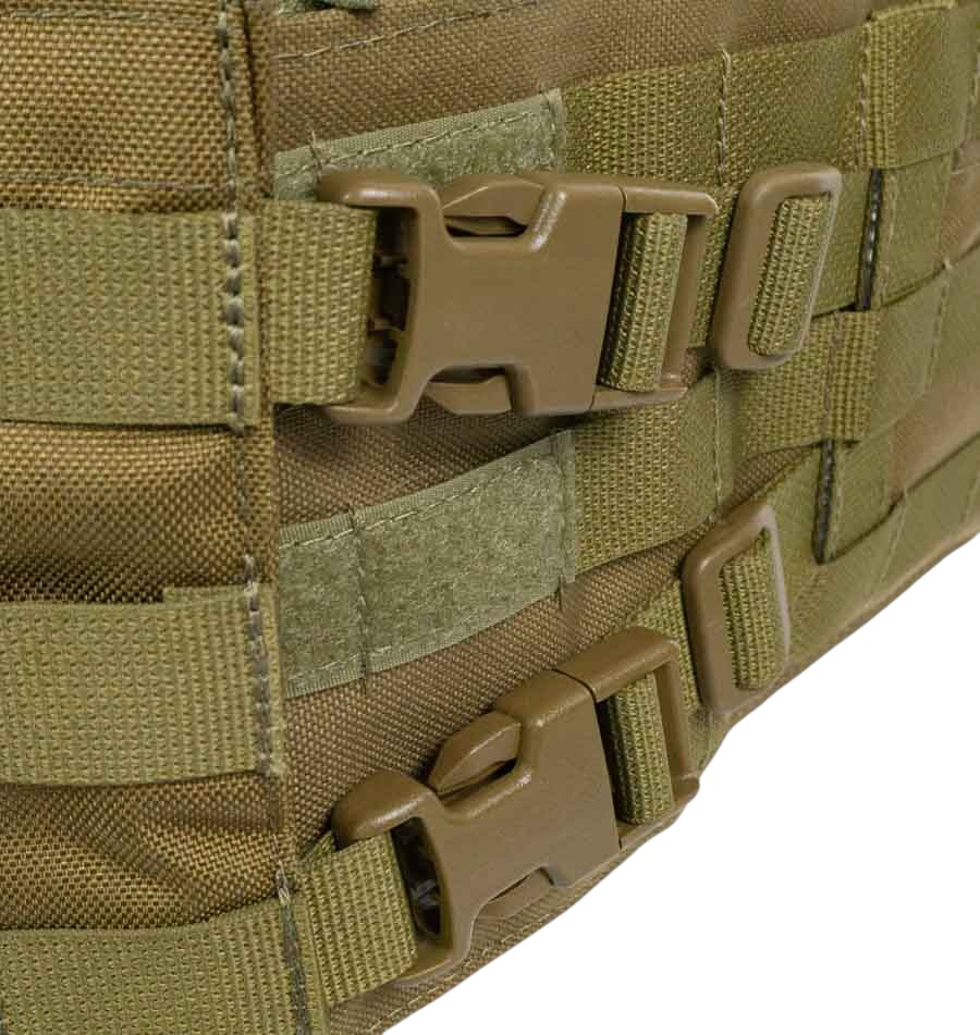 Конструкция нагрудника включает в себя удобные лямки для комфортной фиксации на теле, а также панели MOLLE для крепления подсумков, кобур, радиостанций и других аксессуаров.