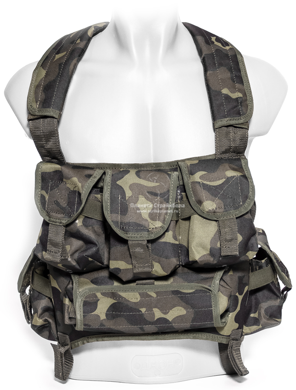 Жилет изготовлен из качественного износо- и влагостойкого Полиэстера-600. Все швы и стропы хорошо прошиты. Цвет - камуфляж. Фурнитура представлена двумя металлическими трехщелевыми пряжками, пластиковыми фастексом и двухщелевой пряжкой.