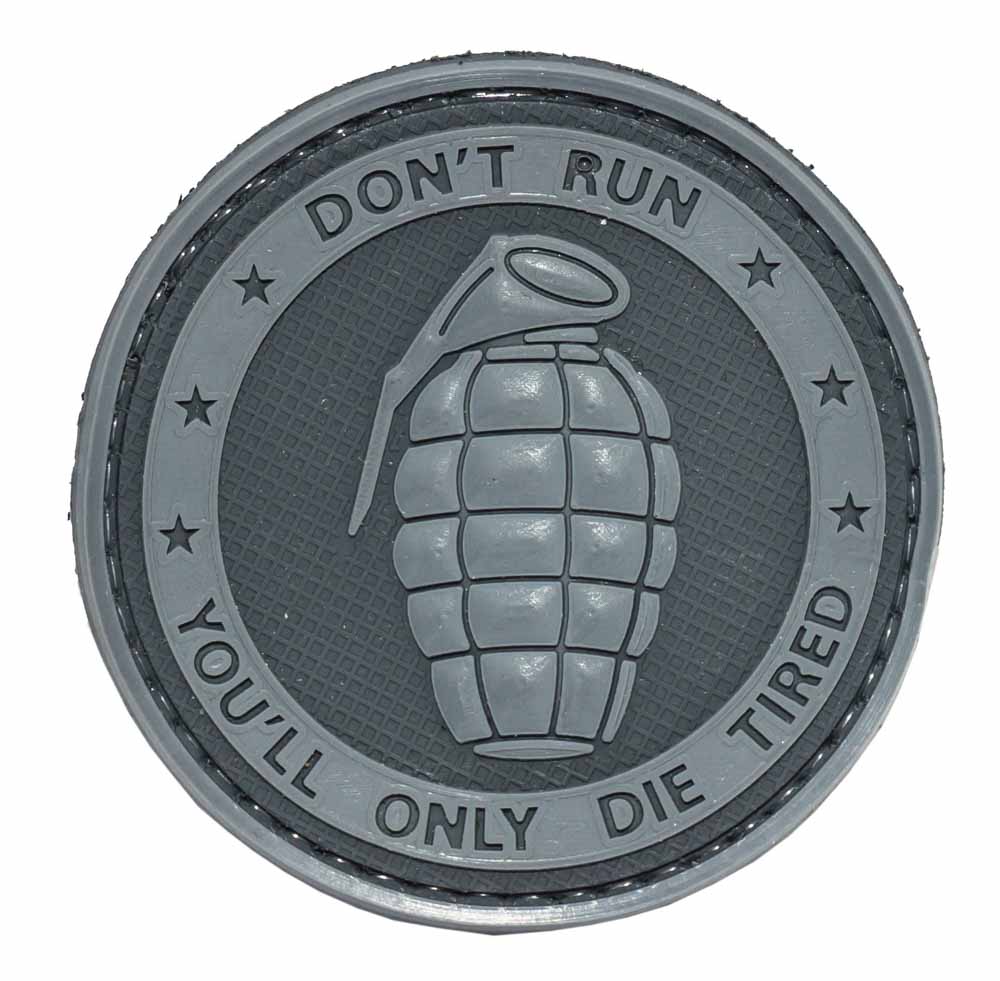 Против мощной осколочной гранаты количество приемов строго ограничено, чаще всего вариантов кроме неминуемой гибели просто не остается. Этот красивый ПВХ патч с осколочной гранатой говорит именно об этом: «не беги, ты лишь умрешь уставшим». Изнанка имеет велкро липучку для приклеивания к велкро панелям.